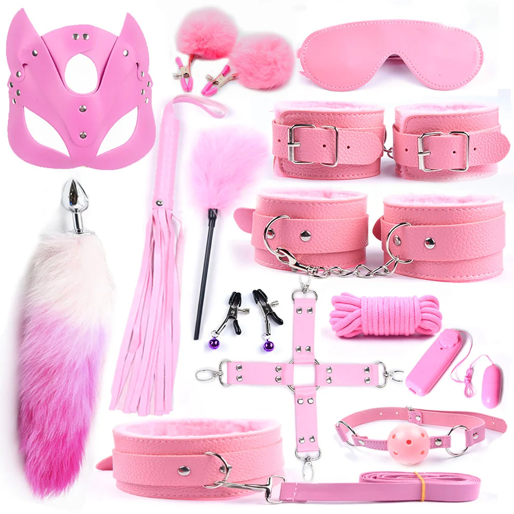 14 Acessórios BDSM Bondage Algemas Chicote Plug com Cauda Conjunto Sexy