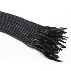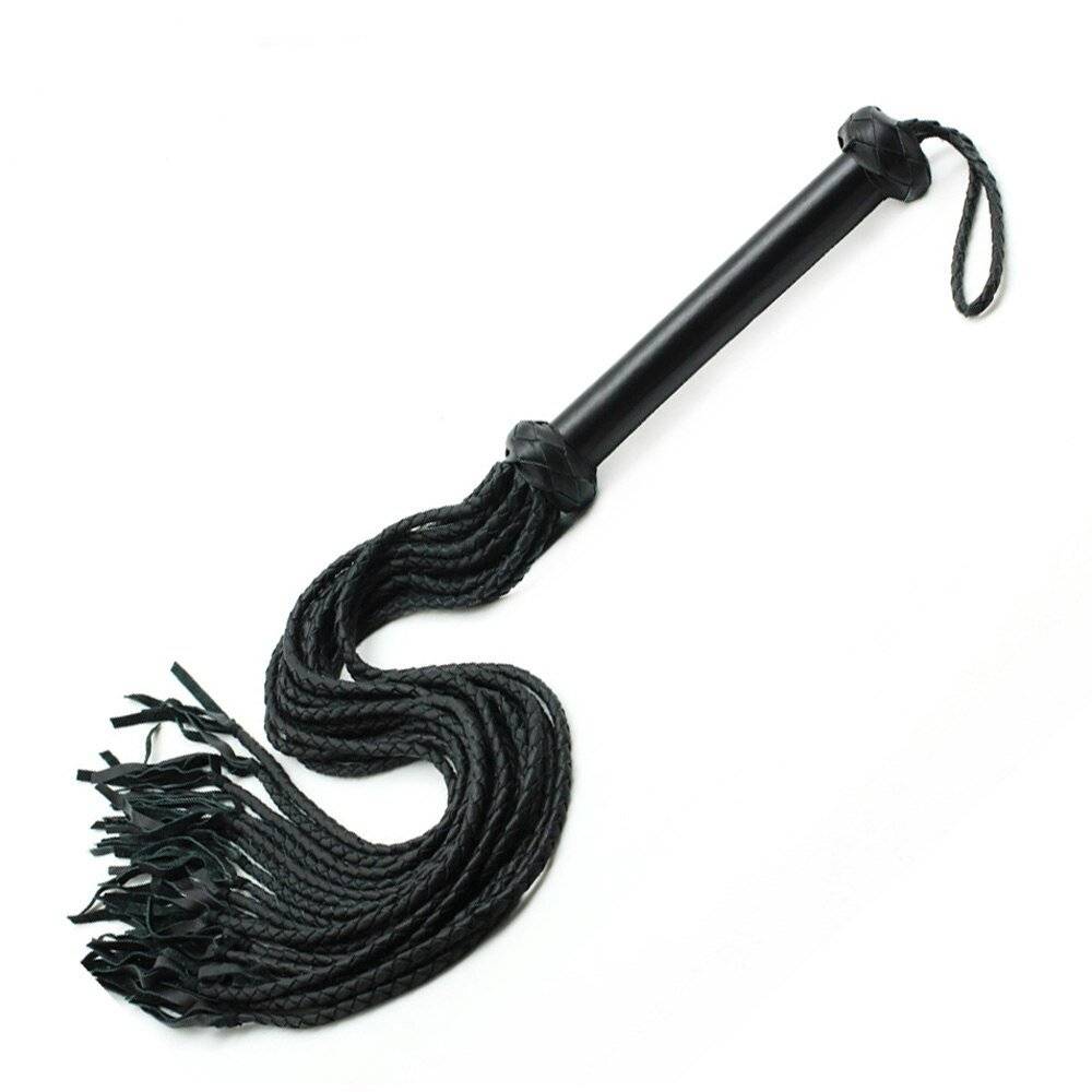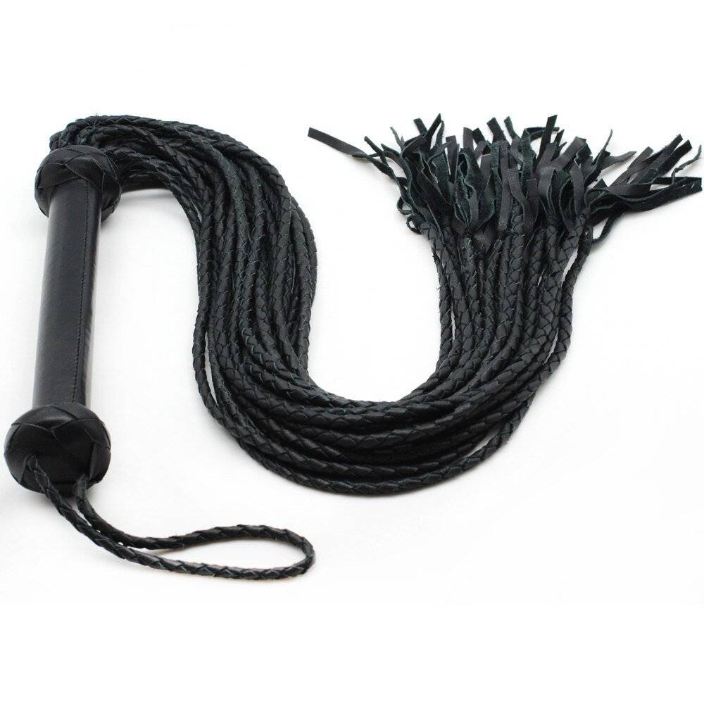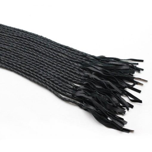 Açoite flogger de tamanho grande, composto por cabo e 12 filamentos de couro trançado.