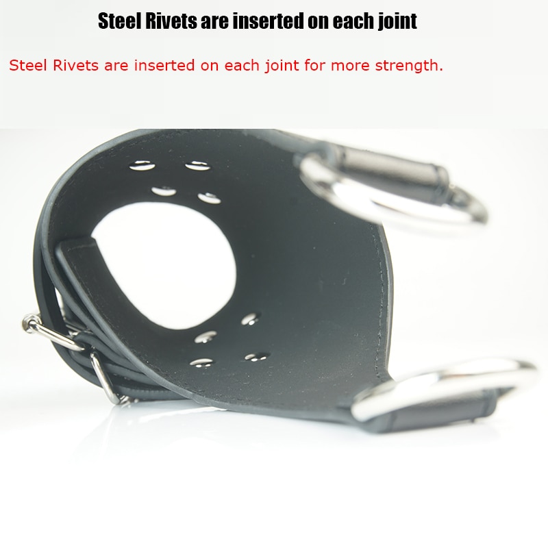 Algemas com suporte para suspensão parcial. Argolas de metal e tiras de couro grossas.