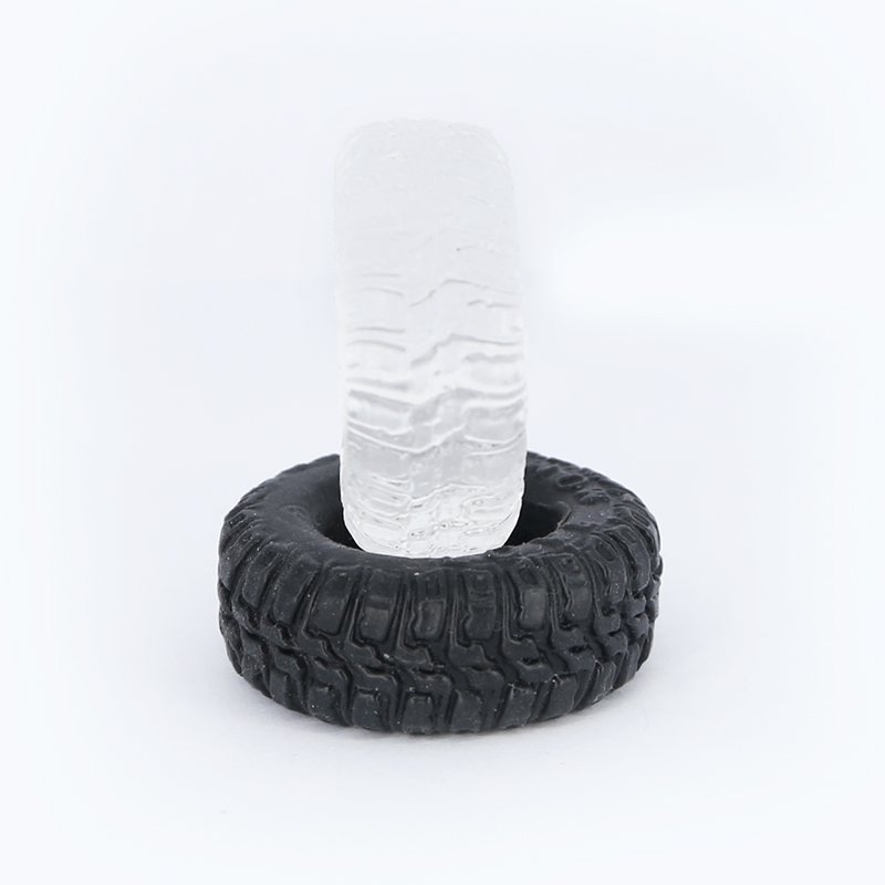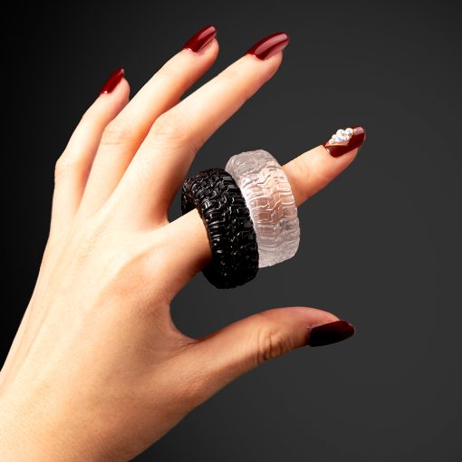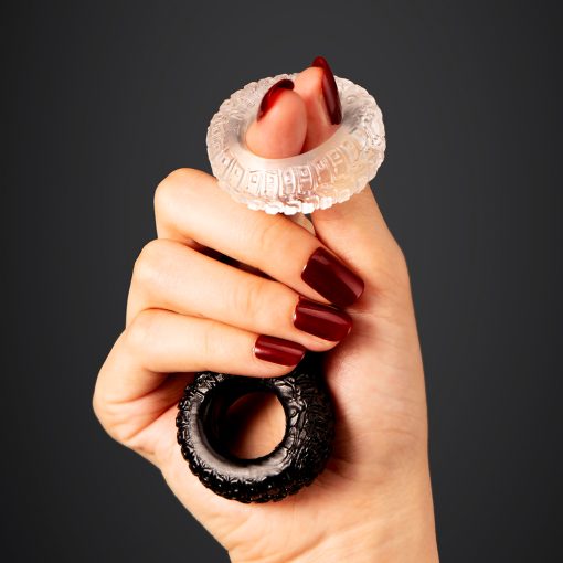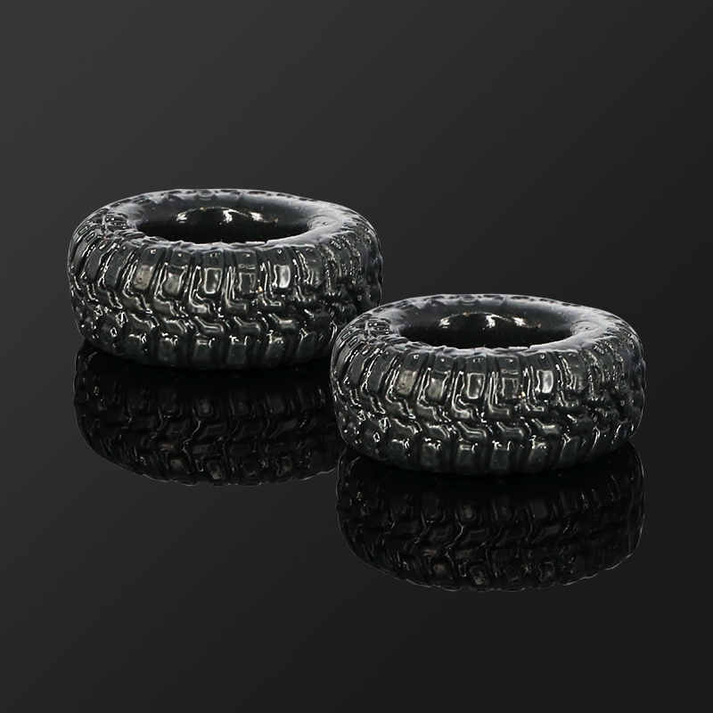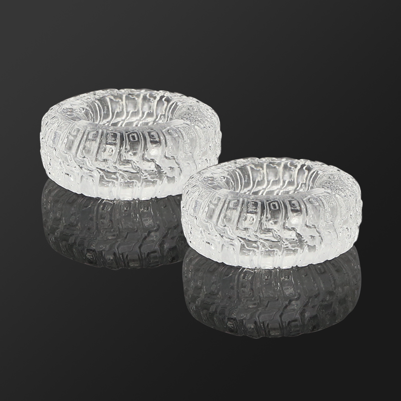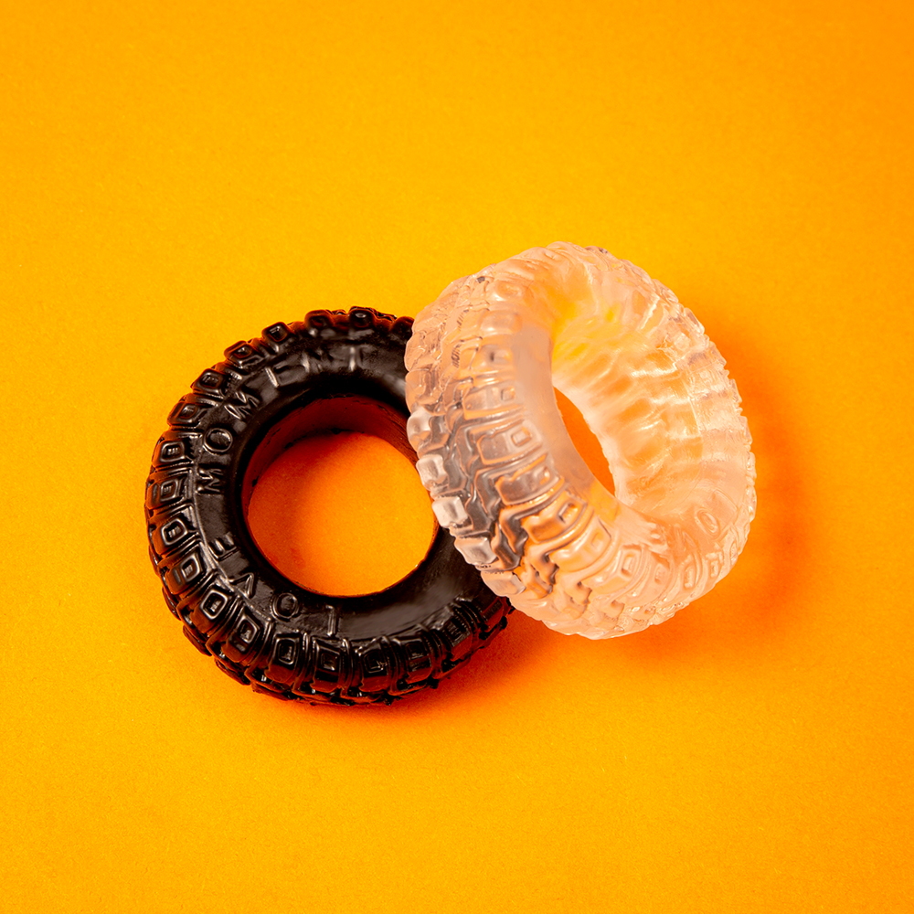 Dois anéis inclusos no pedido. Disponíveis nas cores transparentes e escuras. São feitos em silicone macio e com texturas de pequenos pneus. Bote esse caminhão na garagenzinha.