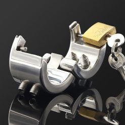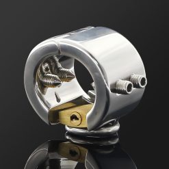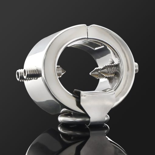 Este anel peniano é de beleza característica dos metais polidos e ao mesmo tempo intimidador com estrutura de cadeado e espinhos. Redondo e brilhante. Nas suas superfícies ainda há um sistema de prendimento por cadeado. Este modelo possui parafusos laterais com pontas afiadas Allen.