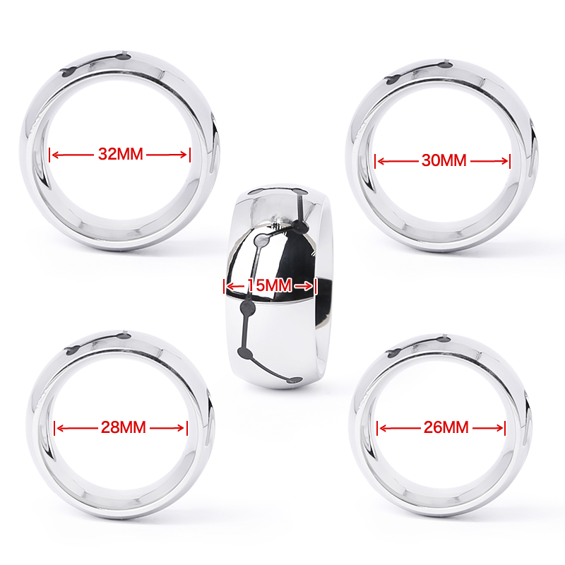 Estes anéis penianos são de beleza característica dos metais polidos e brilhantes. Nas suas superfícies ainda há entalhes delicados em forma de constelações. Utilize estes anéis para melhorar o seu desempenho sexual e toque as estrelas do prazer. Você verá uma nova constelação de sensações.