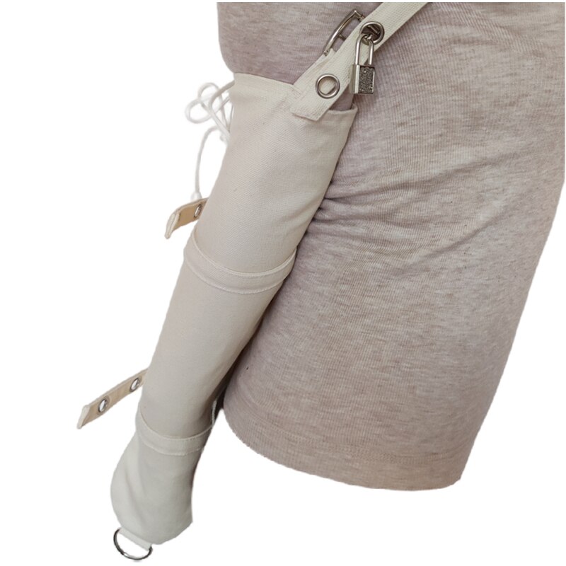 Armbinder tecido e correia de denim para arnês, bondage e restrição para braço. Manga completamente fechada.
