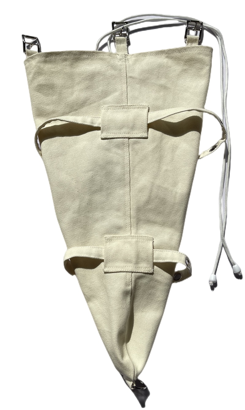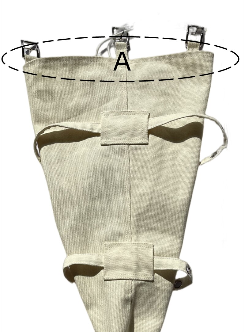 Além disto, as extremidades das mangas possuem argolas para prender da forma que você imaginar. Utilize ganchos, cordas e outras coisas. É possível passar as faixas de contenção por cima dos ombros, a fim de garantir que a manga não seja removida.