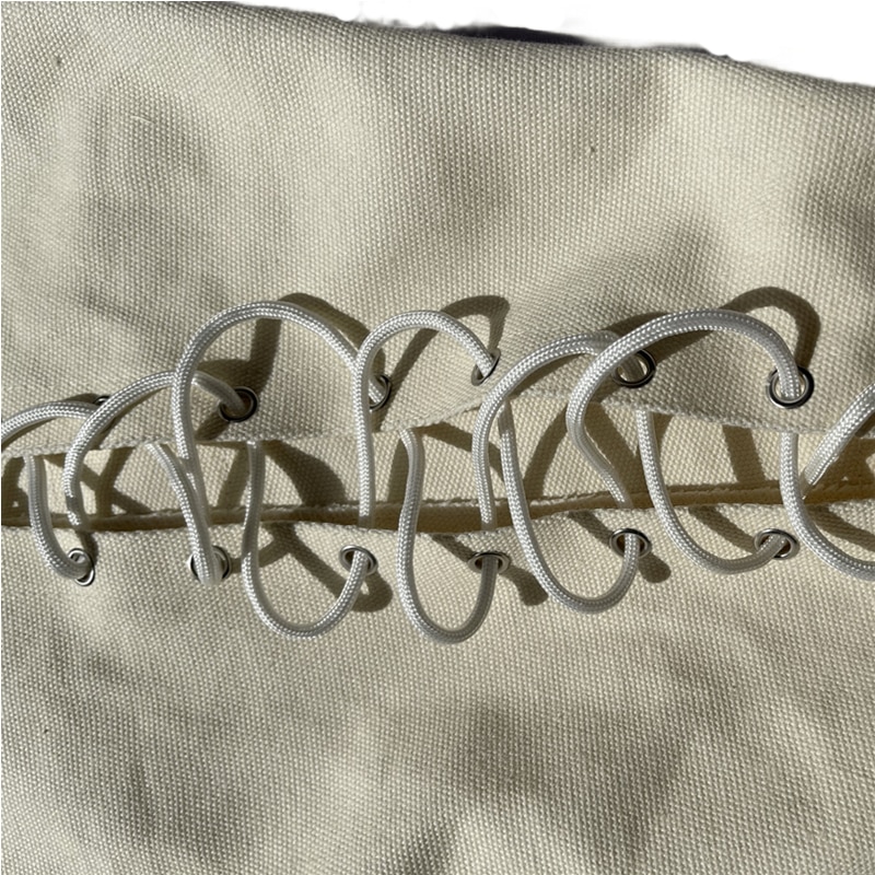 Cada peça metálica é inoxidável, feitas com ligas aço. Cada manga também tem cordas longas e grossas de nylon para apertar e regular até seu formato desejado.
