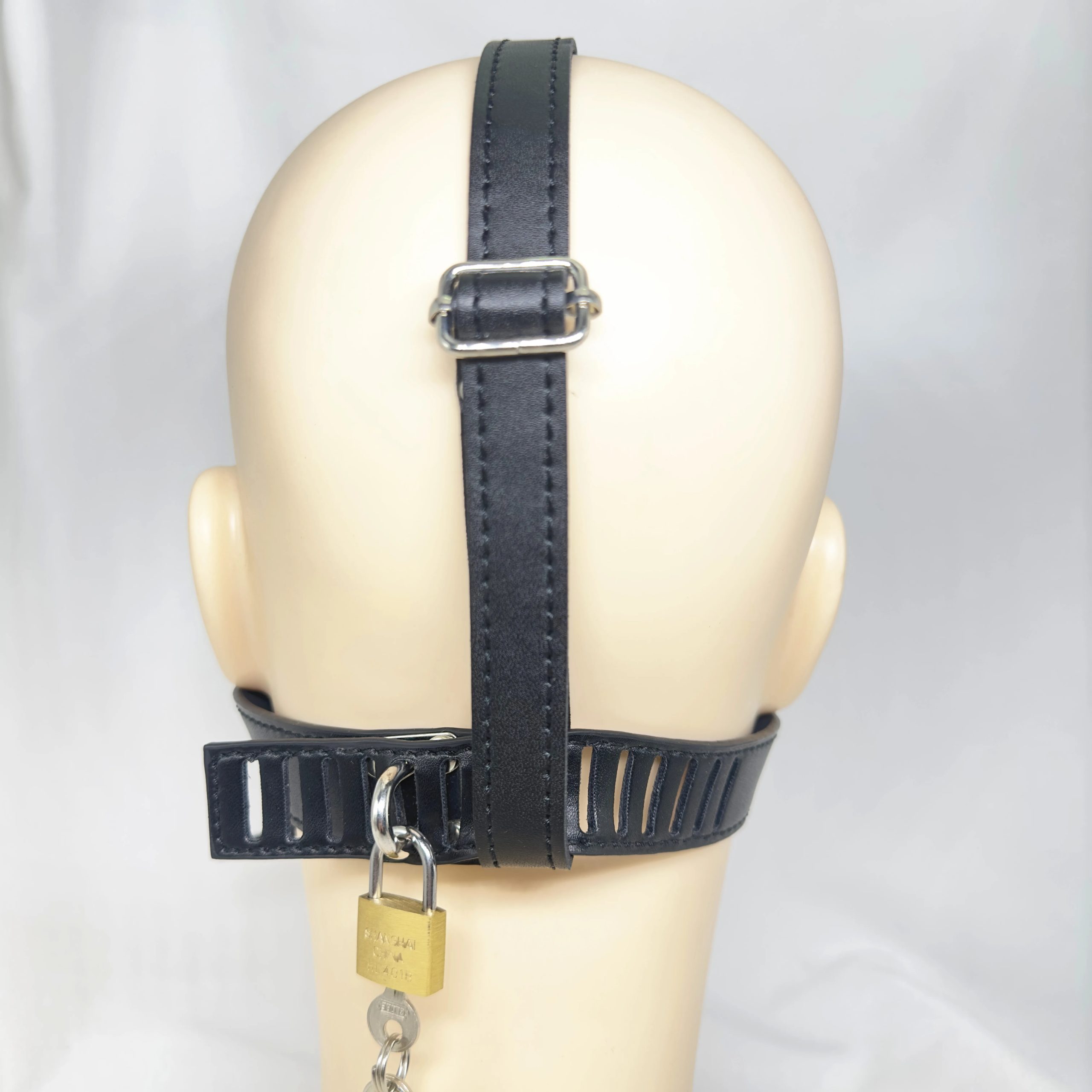 - Fivela com presilha e cadeado: Permite prender o harness ball gag em toda a cabeça sem a possibilidade de tirar sem abrir o cadeado.