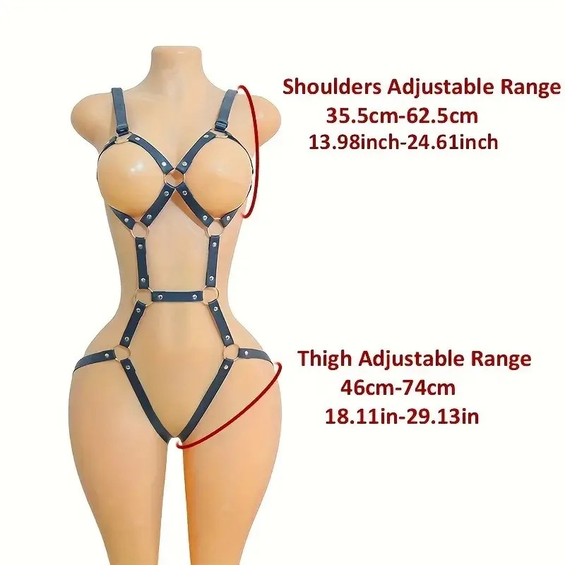 Liberte sua sensualidade com este arnês corporal feminino estilo BDSM, perfeito para quem deseja explorar o erotismo com atitude e poder. Com design enjaulado, tiras ajustáveis e acabamento gótico em couro sintético, este cinto envolve peito, cintura e pernas, criando uma silhueta marcante que exala dominação e desejo.