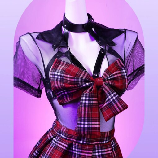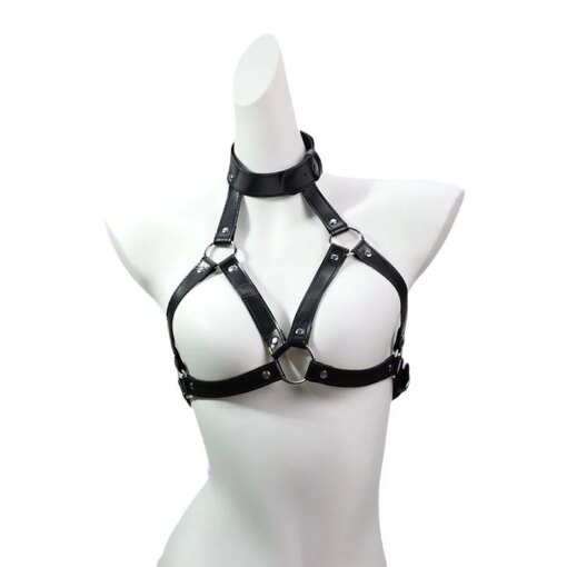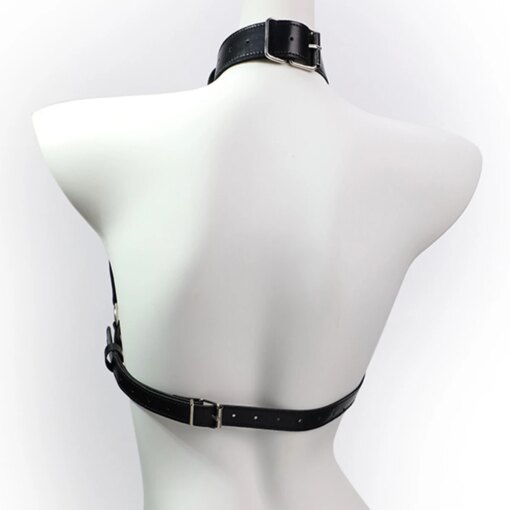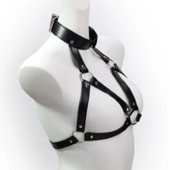 Feito em couro sintético, o design realça os seios com tiras ajustáveis que moldam o corpo e criam um visual fetichista, provocante e ao mesmo tempo elegante.