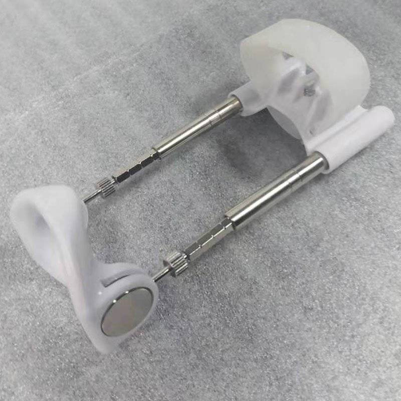 1. parafuso nas barras de alongamento fornecidas para ajustar o dispositivo a um comprimento de partida adequado. Normalmente o dispositivo deve ser ajustado para 1 cm mais longo do que o comprimento do seu pênis totalmente esticado em seu estado flácido.