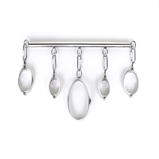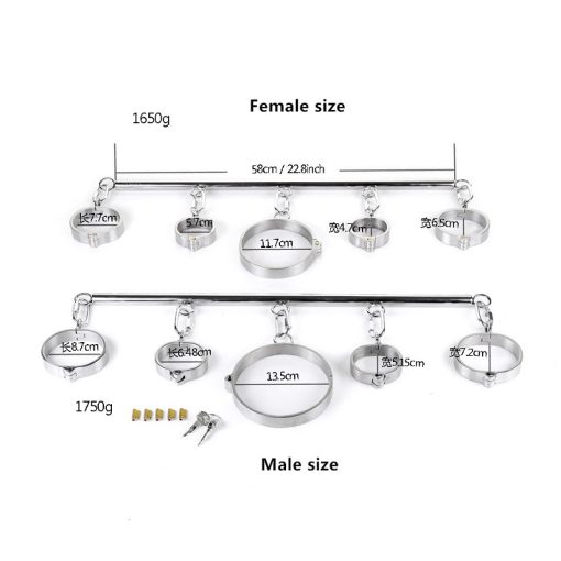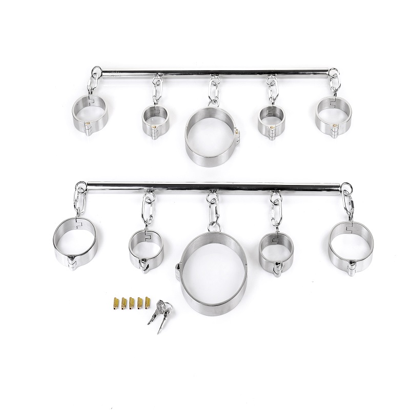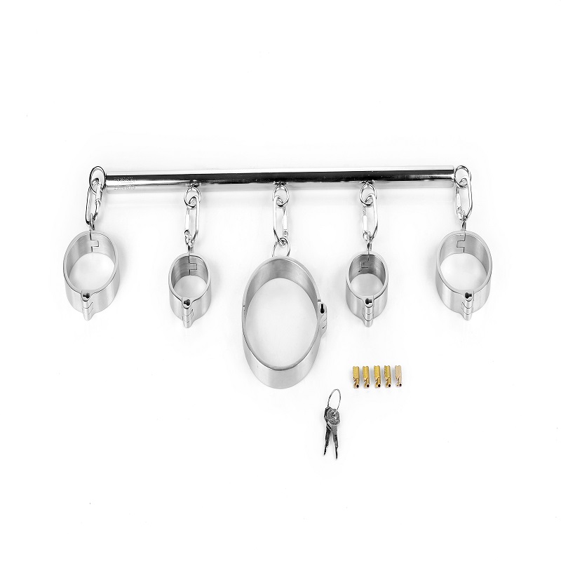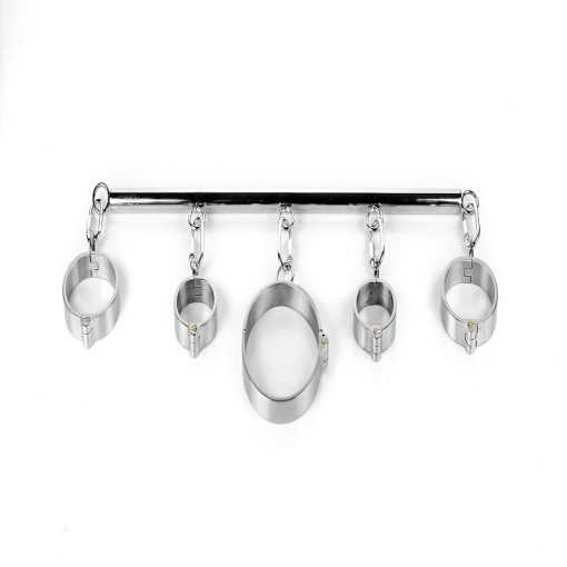 São 5 grilhões fixados em uma barra de metal inoxidável com tamanho de até 60 cm de largura. Cada grilhão pode ser trocado de posição por causa dos seus ganchos fixadores de alumínio, permitindo que você altere as posições para abrir ou fechar mais a restrição de pernas, por exemplo.