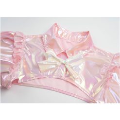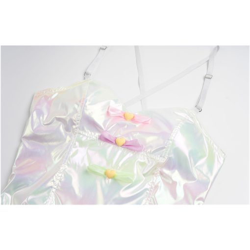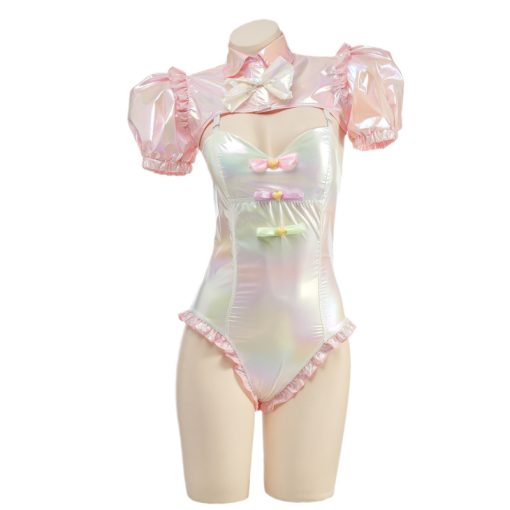 Um maio brilhante e fofo para realizar as suas fantasias e fetiches ou as do seu par. Disponível nas cores rosadas e brancas. Com laços e tiras de rendas, na virilha e no top. Fantasia para jovens guerreiras, esperançosas e animadas. Preparadas para encontrar o amor e punir o vilão. Bodysuit justo, com fecho éclair nas costas e tiras de elastano.