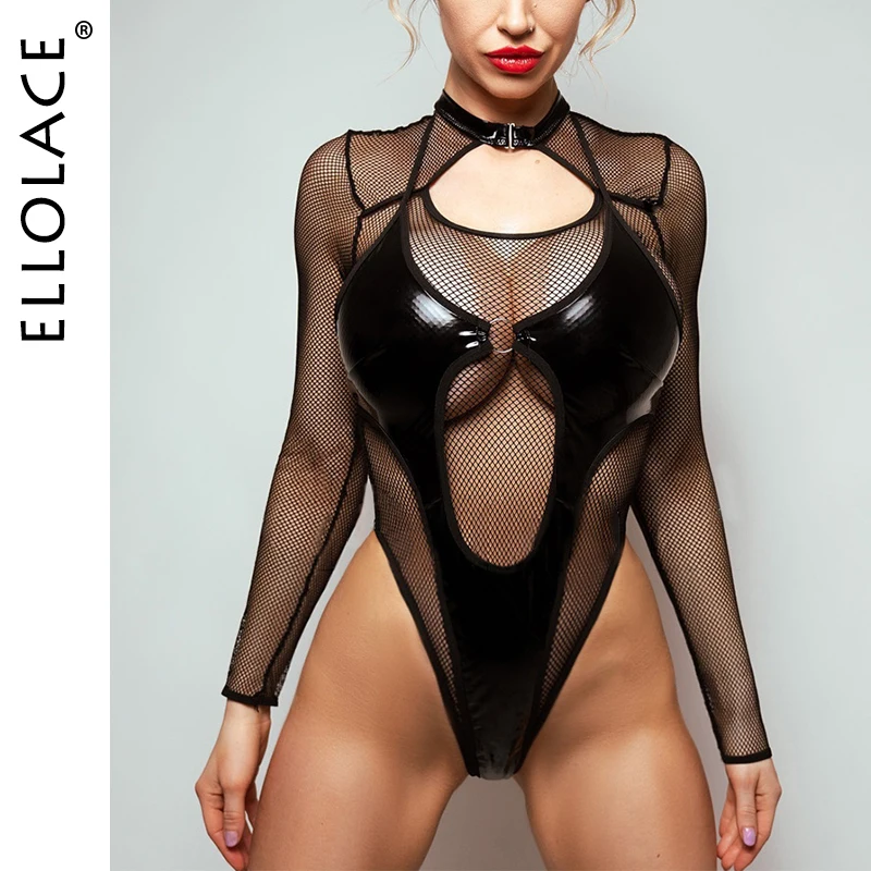 Bodysuit Erótico Ellolace em Malha PU com Abertura Crotchless – Lingerie Fetiche Sexy