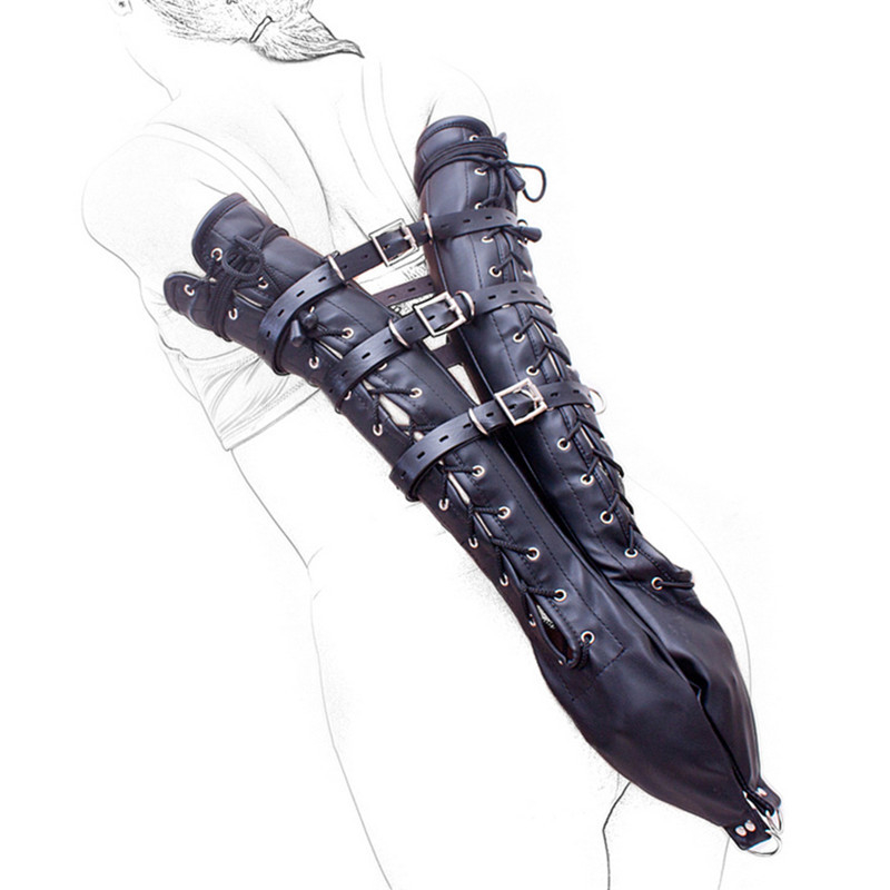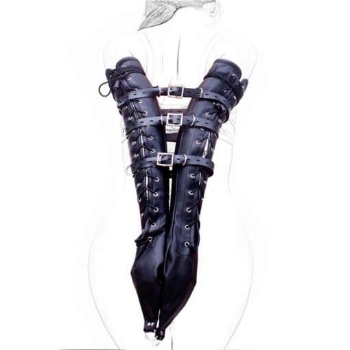 Cintas e correias de couro para arnês bondage e restrição para braços. Mangas completamente fechadas.
