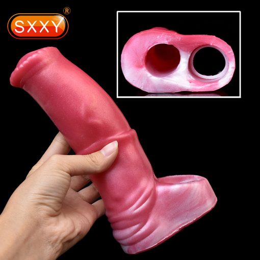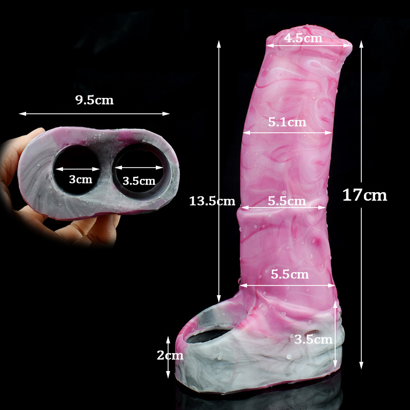 O comprimento total do dildo com glande de cavalo é de 17 cm de comprimento. Os orifícios da capa de silicone são de, no mínimo, 3 cm de diâmetro, sem estarem esticados.