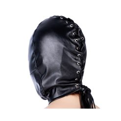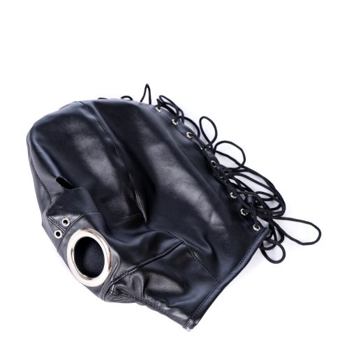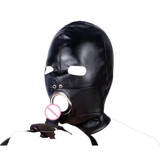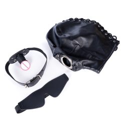 Capuz de couro e contenção completa da cabeça. Possui uma mordaça em formato de pênis.