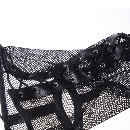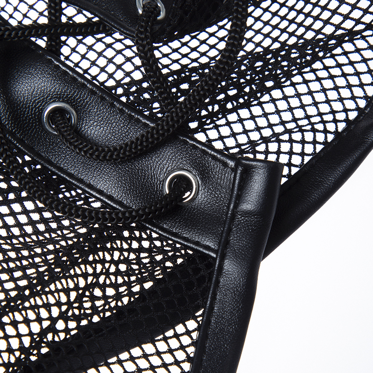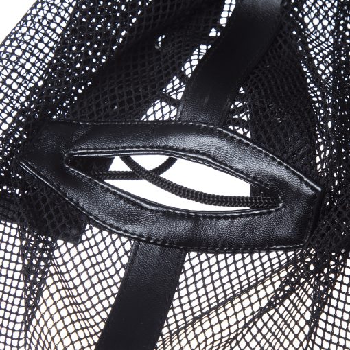 As tiras centrais são feitas de couro sintético e costuras com fios de nylon. Item interessante para fantasias bdsm de couro e dominação. Esta máscara cai muito bem para fetiches.