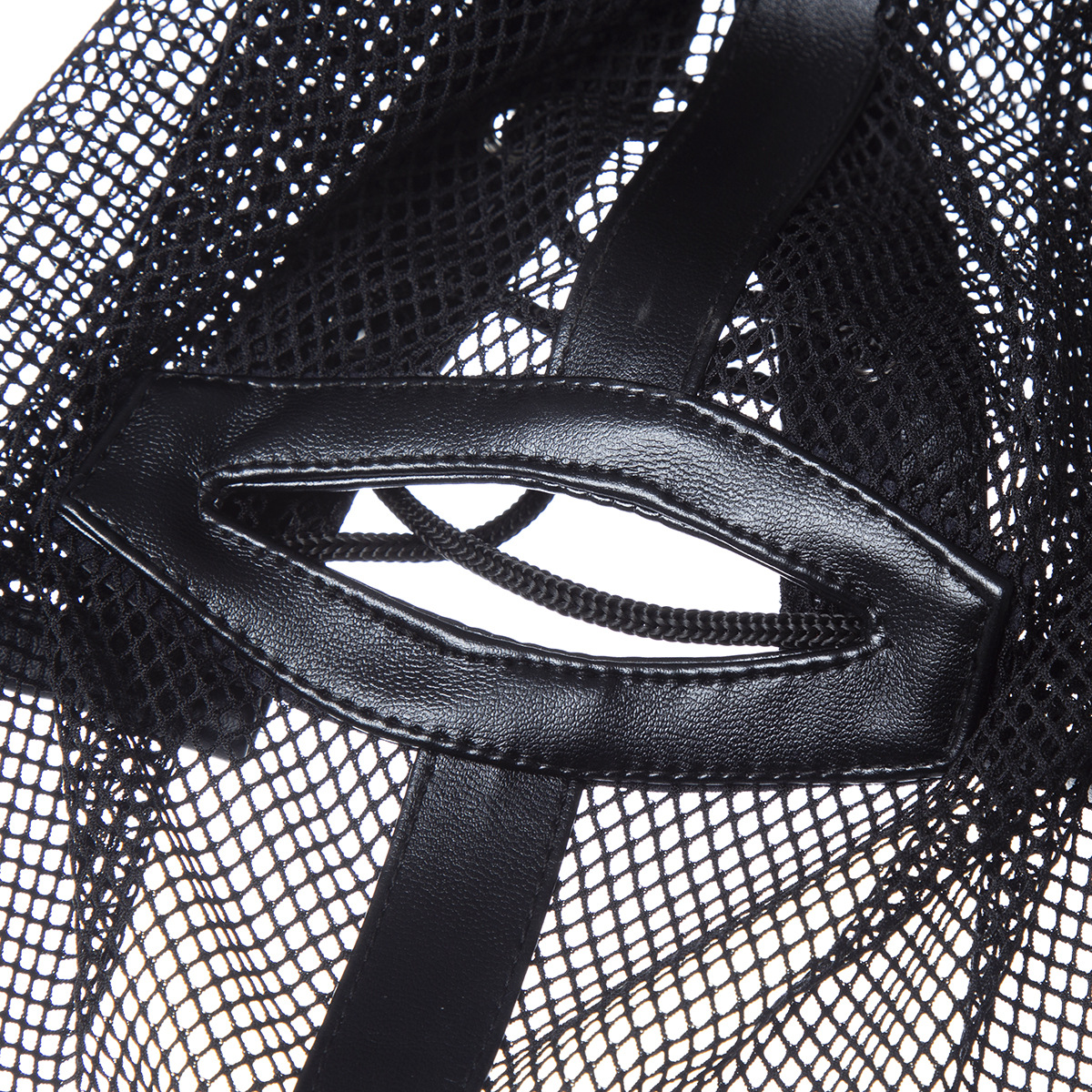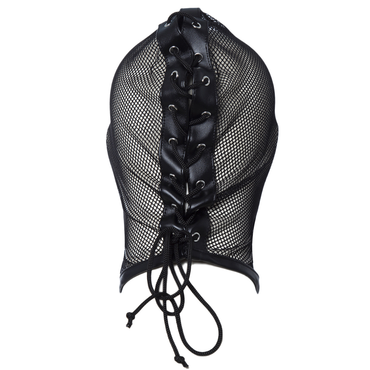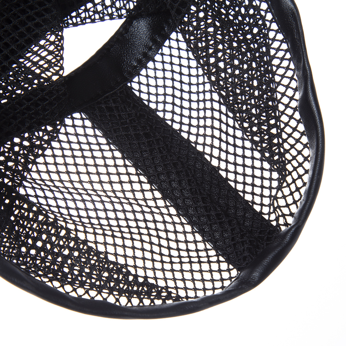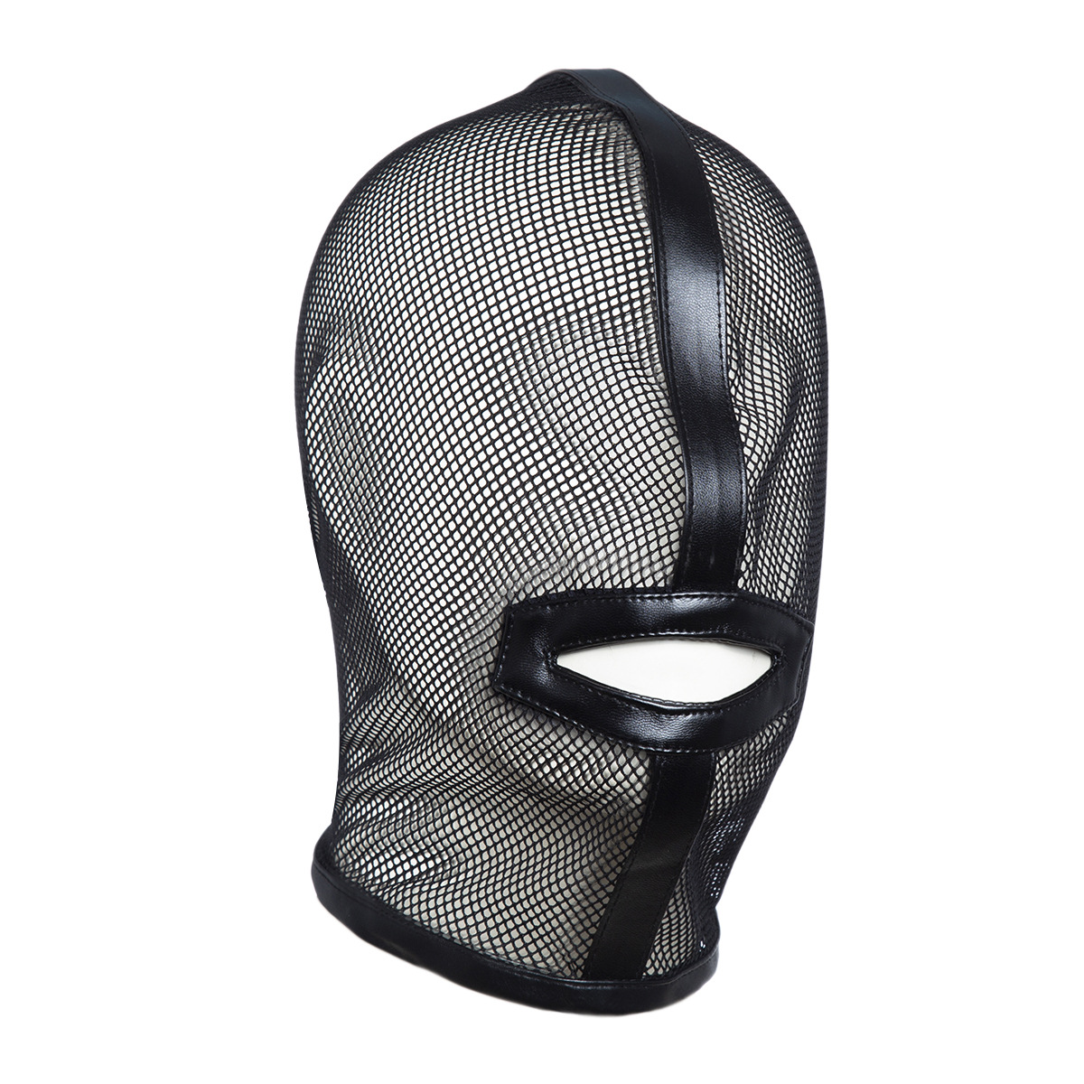 Capuz de couro com grade de nylon. Fantasia e fetiche dominadores.