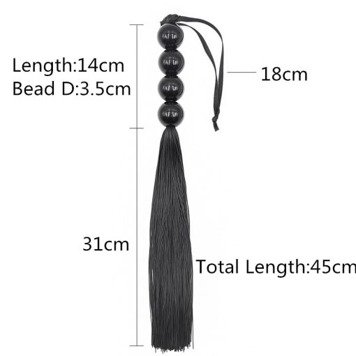 Permite impactos moderados com o comprimento total de 45 cm. 31 cm para a extremidade impactante da chibata. O cabo permite uma pegada total de 18 cm, o que garante aderência e precisão em cada golpe, além de ser difícil de escapar pelos seus formatos de bolas.