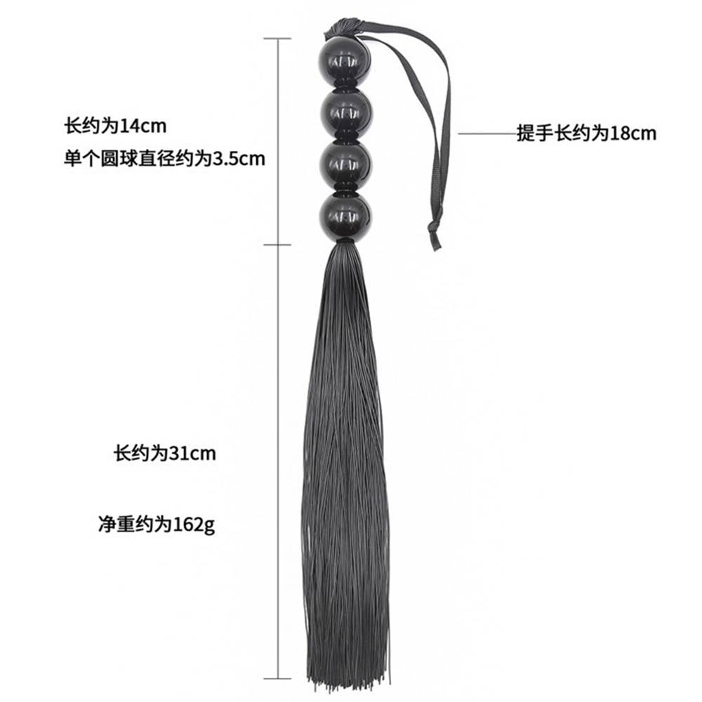 Permite impactos moderados com o comprimento total de 45 cm. 31 cm para a extremidade impactante do flogger. O cabo permite uma pegada total de 14 cm, o que garante aderência e precisão em cada golpe, além de ser difícil de escapar pelos seus formatos de bolas.