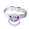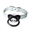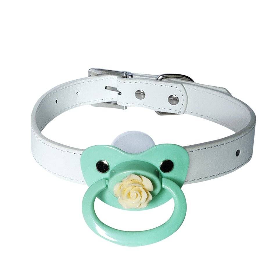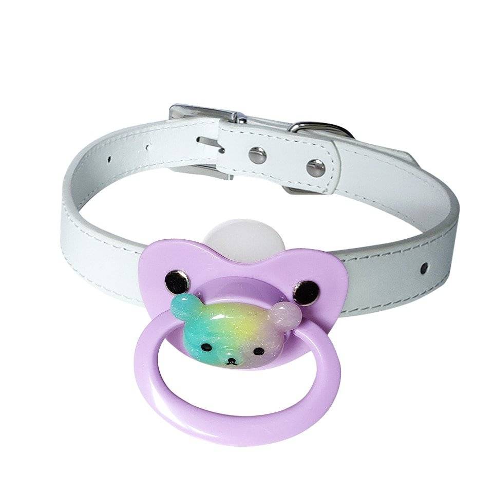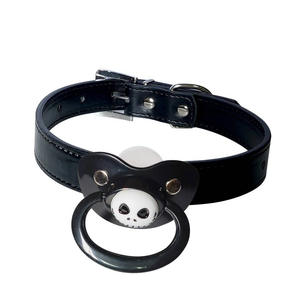 Mordaças com chupetas para fetiches e práticas BDSM, feitas em couro sintético e metal. Bico de silicone.