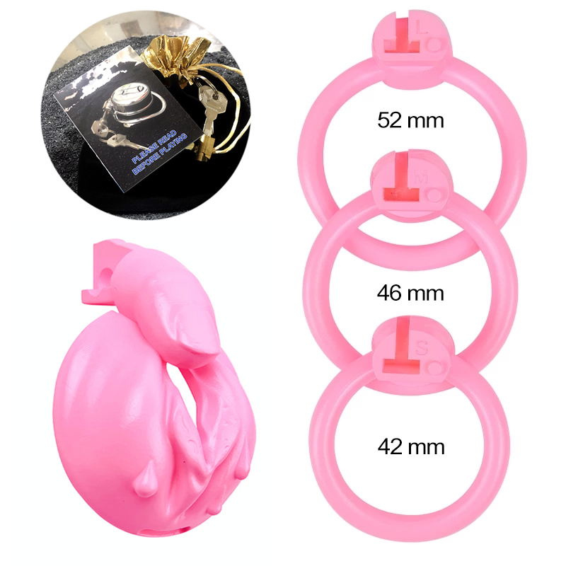 Gaiolas de castidade de tamanhos únicos pequenas, com 3 anéis de base inclusos. São modelos de cinto compactos, pesando aproximadamente 80g de puro ABS rosado ou roxo. Possuem aberturas para passagem de líquidos, caso haja a necessidade de urinar durante o uso. Podem ser molhados.