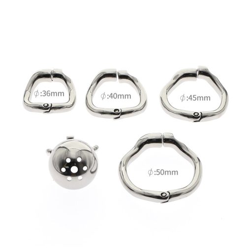 Gaiola de castidade de tamanho único pequena, com opção de 3 anéis de base redondos e retos de tamanhos diferentes.