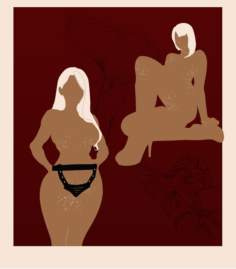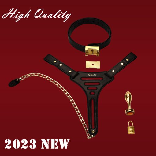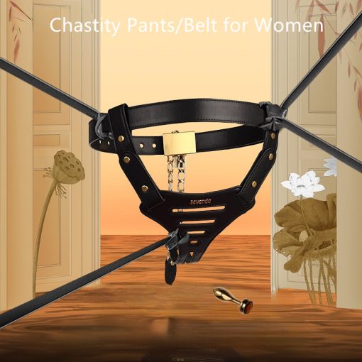 Cintas de castidade femininas de couro, com encaixes para plug vaginal parafusável.
