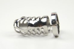 Gaiola de castidade de tamanho único médio-grande, com anel com dobradiça. A gaiola é feita em peça única com design bonito e com traços inclinados. Aço liso e de toque suave à pele. A parte da glande tem o formato de um X. Talvez por marcar o local de uma grande descoberta.