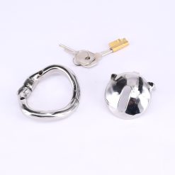 Gaiola de castidade de tamanho único micro, com 4 anéis de base opcionais. É um modelo de cinto com gaiola de domo e anéis metálicos anatômicos capaz de cobrir muito bem e prevenir quase qualquer contato com o pênis. Redondo como a porta de um cofre. Guarde bem este tesouro.