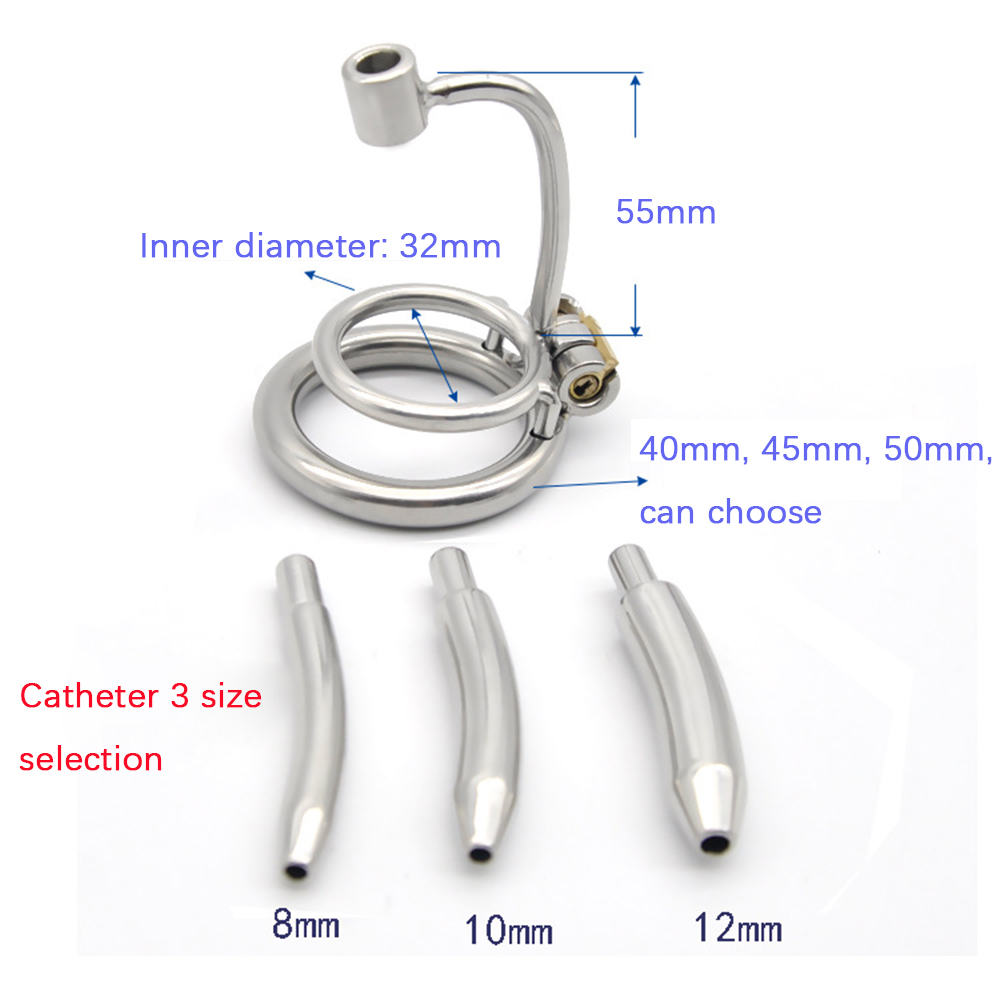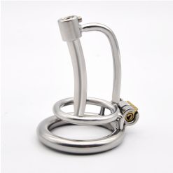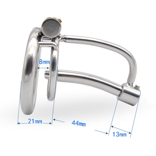 Cinto de castidade interno que pode ser utilizado com um dos 3 tubos de cateteres de diâmetros diferentes. O arco é de tamanho único médio-grande, com opção de 3 anéis de base de tamanhos diferentes. Aço liso e de toque suave à pele.