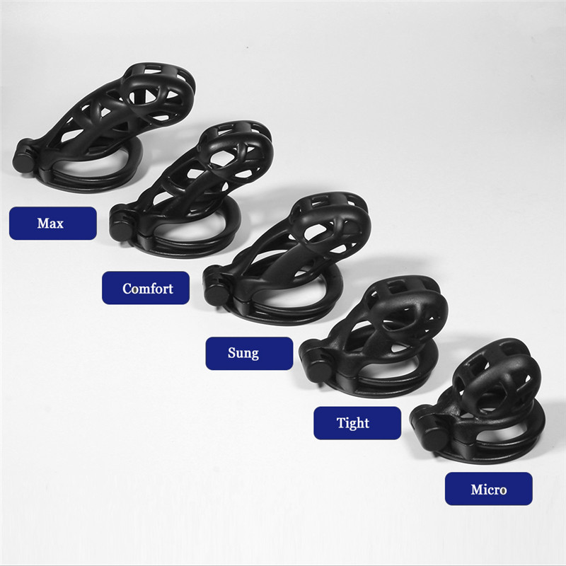 Gaiolas de castidade anatômicas com 5 tamanhos. São 5 anéis de base com uma grande variedade de diâmetros. São anéis de base retos em relação a base do pênis e testículos. Modelos de cintos compactos até os grandes, pesando aproximadamente 80g de plástico ABS nas cores pretas ou rosas.