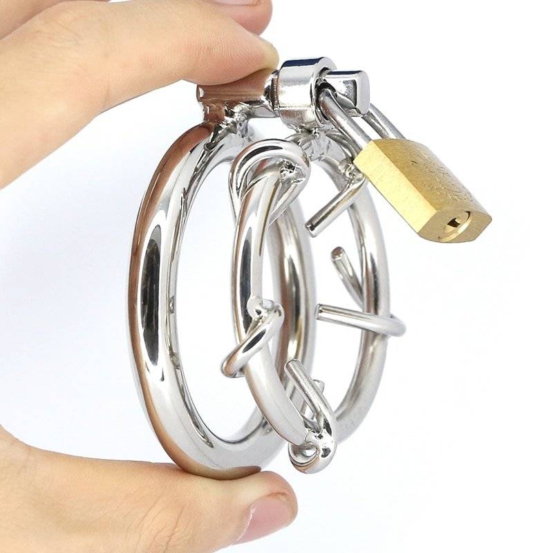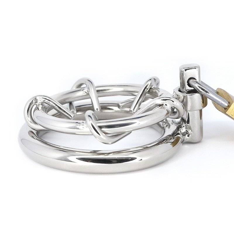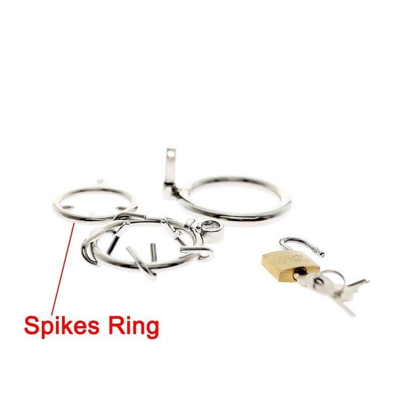 Cinto de castidade sem gaiola, mas com 2 tipos de anéis com espinhos. Se seus pensamentos forem puros e castos, você não sentirá desconforto.