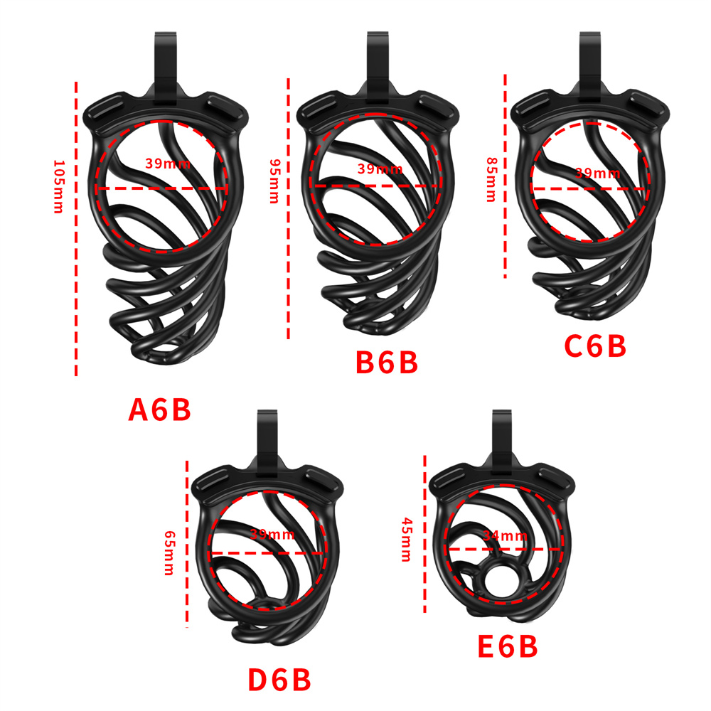 Gaiolas de castidade em 5 diâmetros, do micro ao maxi com formatos divertidos em formatos de espiral, ciclone ou furacão. 4 anéis de base opcionais. É um modelo de cinto com sistema de fechamento embutido por cilindro de bronze. A gaiola possui barras espirais que se assemelham muito a molas. Possui aberturas para passagem de líquidos, caso haja a necessidade de urinar durante o uso. Pode ser molhado.