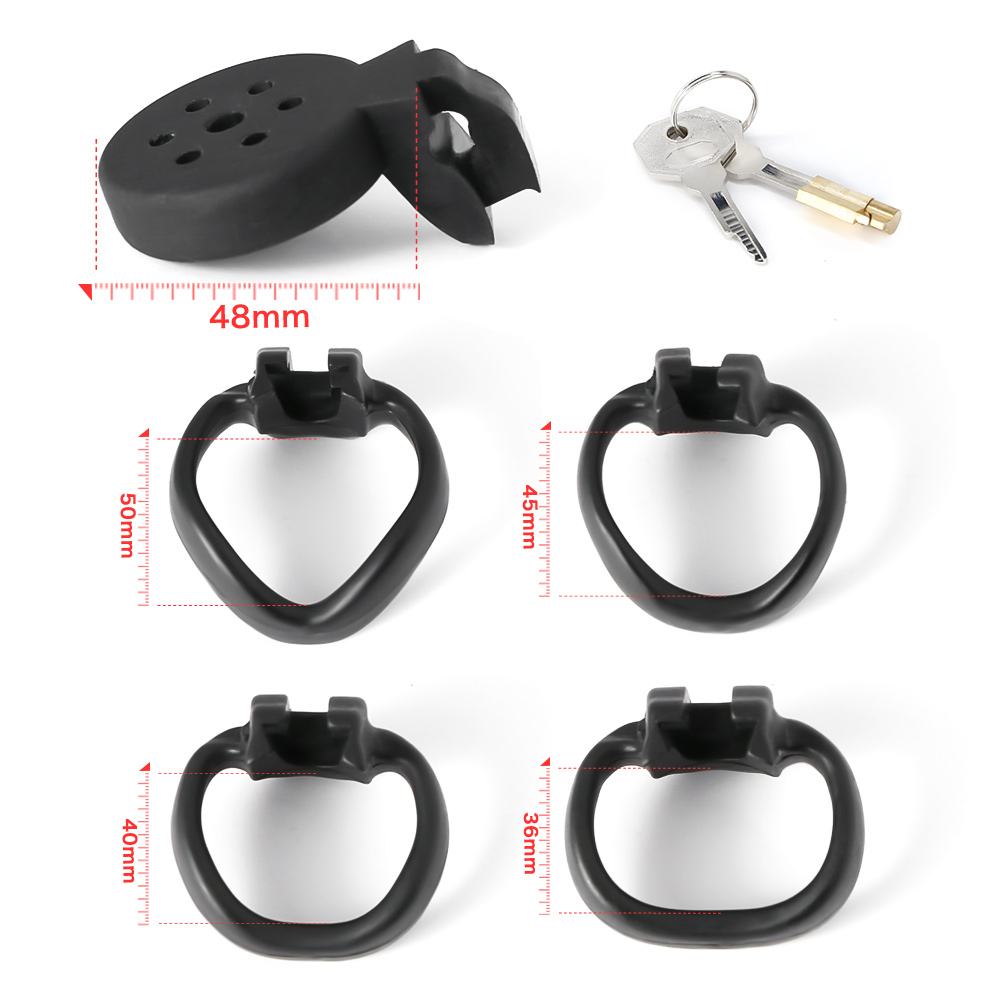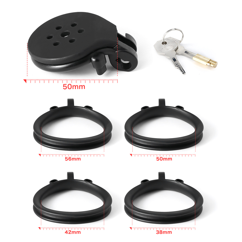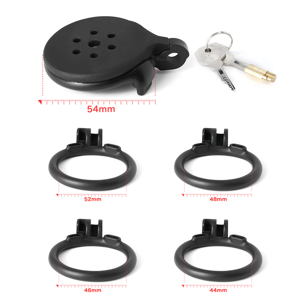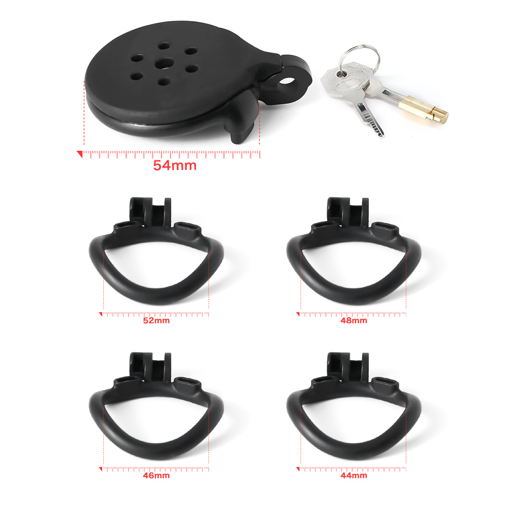 Gaiolas de castidade de tamanhos únicos micros, com até 10 anéis de base opcionais. Modelos de cintos com gaiolas de ABS em formatos de tampas retas. Capazes de cobrir muito bem e prevenir quase qualquer contato com o pênis. São anéis de base em formatos curvados ou retos, em relação a base do pênis e testículos. 80g de plástico ABS nas cores pretas ou brancas.