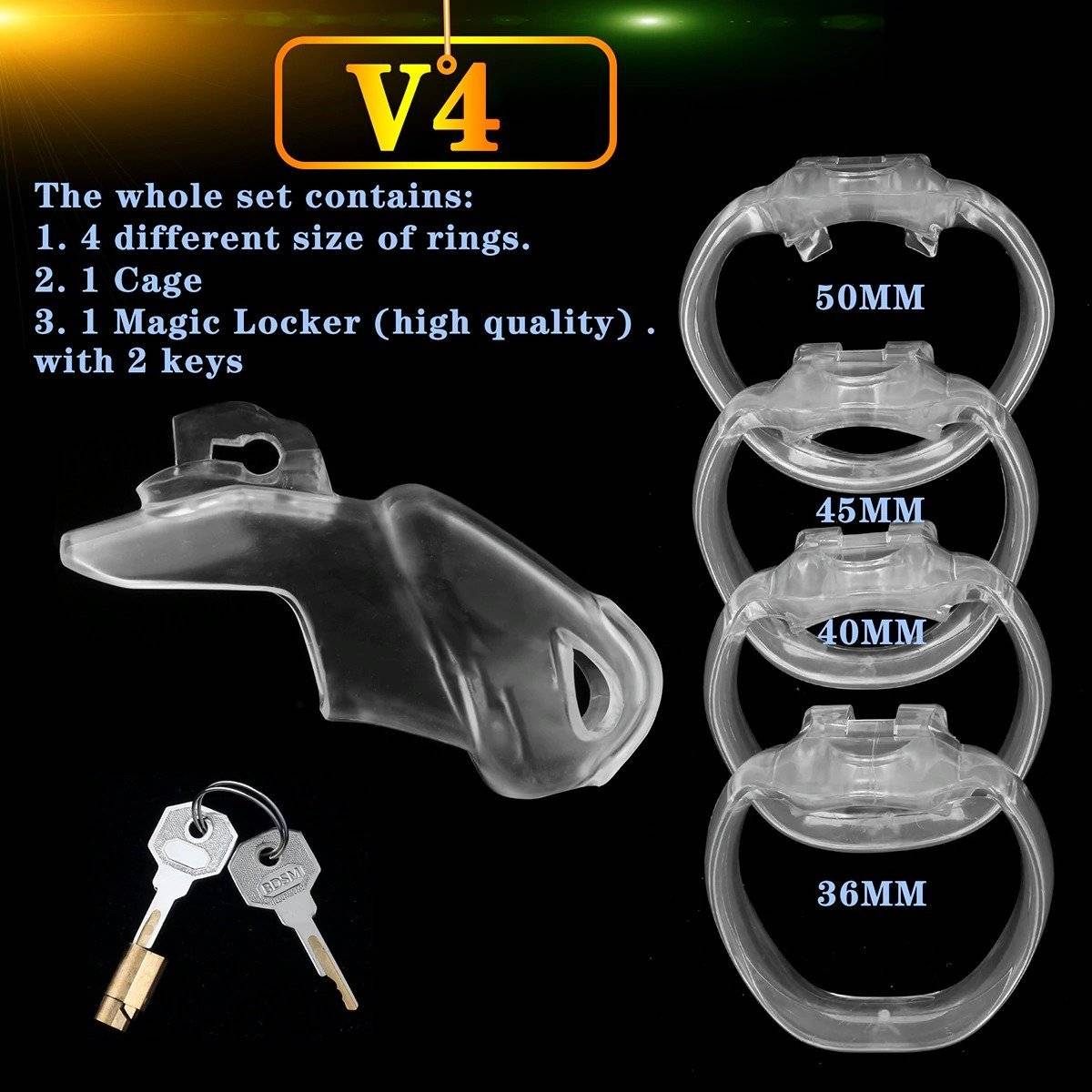 Um conjunto inclui: 1 * gaiola; 4 * anéis de tamanhos diferentes, 1 * cadeado magic locker.