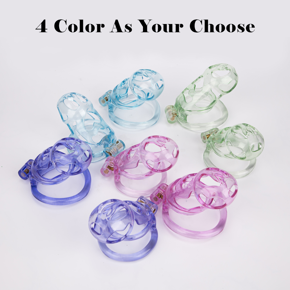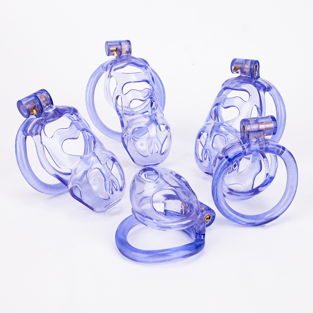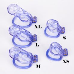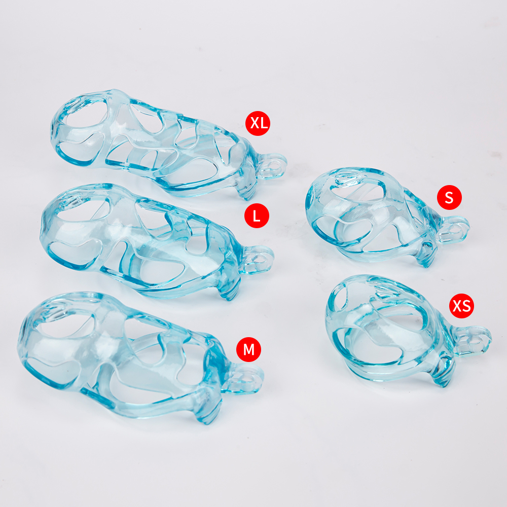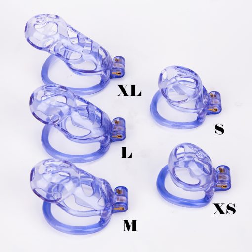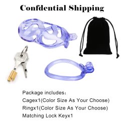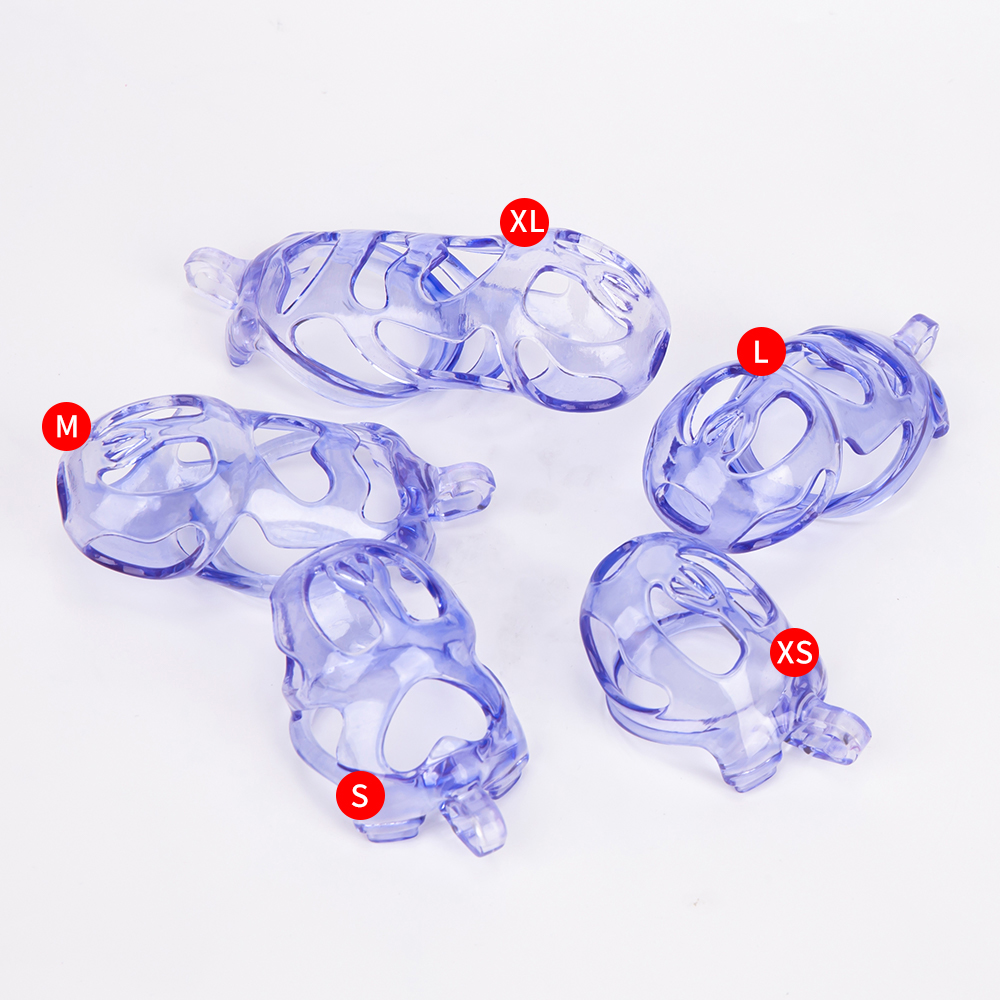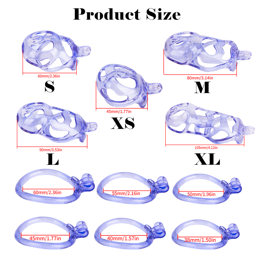 Gaiolas de castidade anatômicas com 5 tamanhos. São 6 anel de base com uma grande variedade de diâmetros. São anel de base retos. Modelos de cinto do compacto até os grande, pesando aproximadamente 80g de plástico ABS nas cores azuis, roxas, verdes ou rosas.
