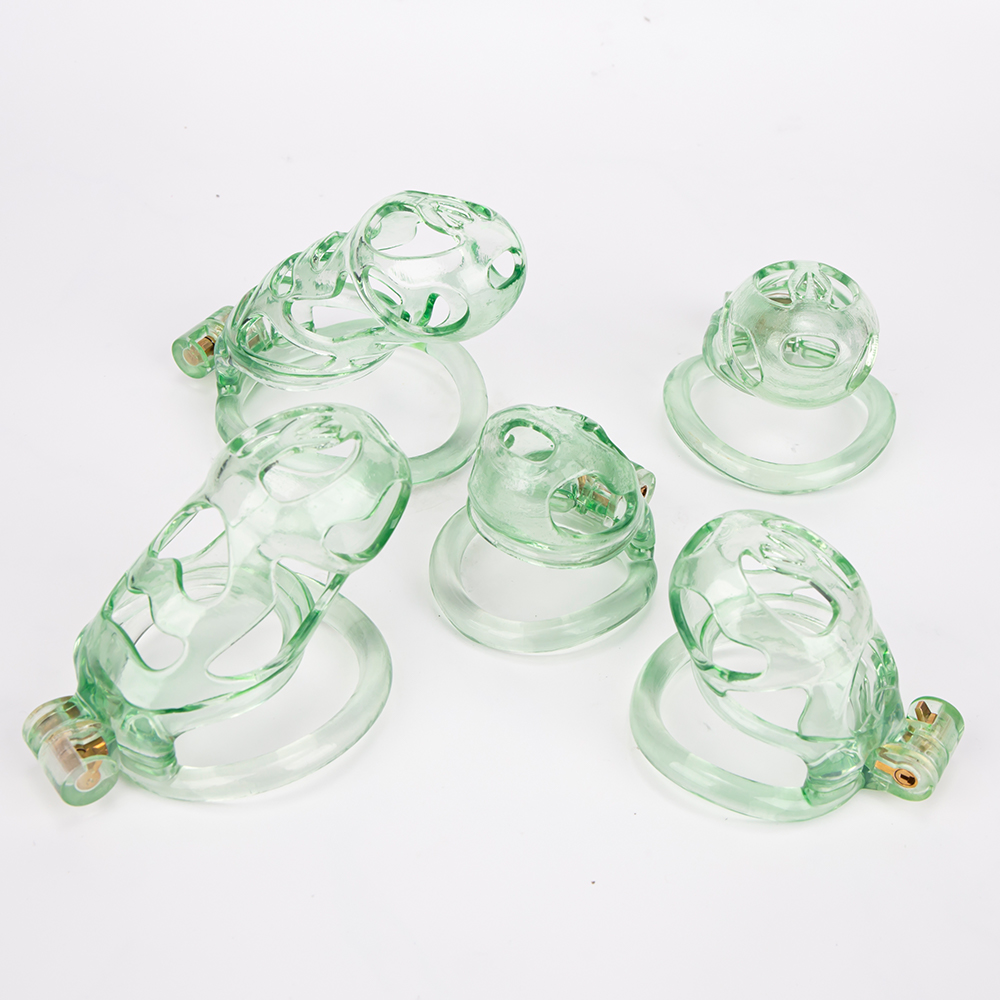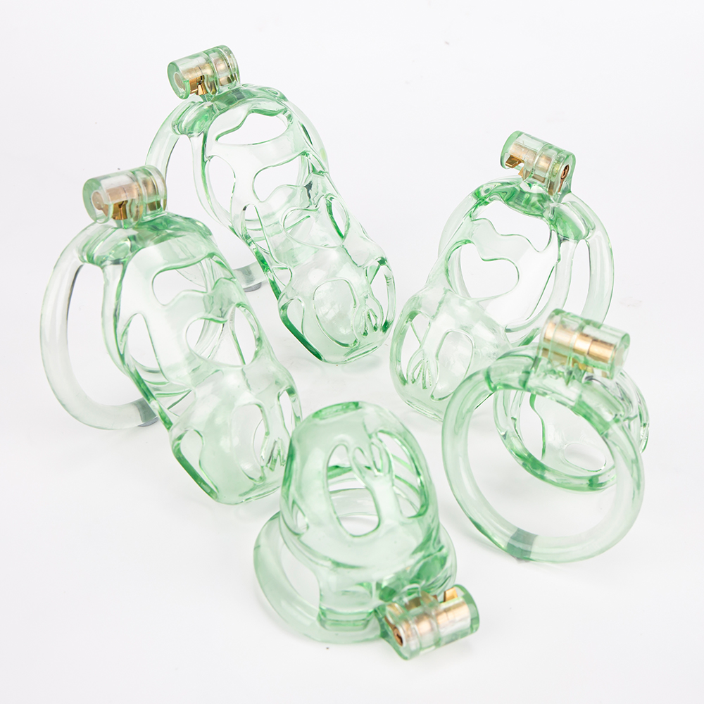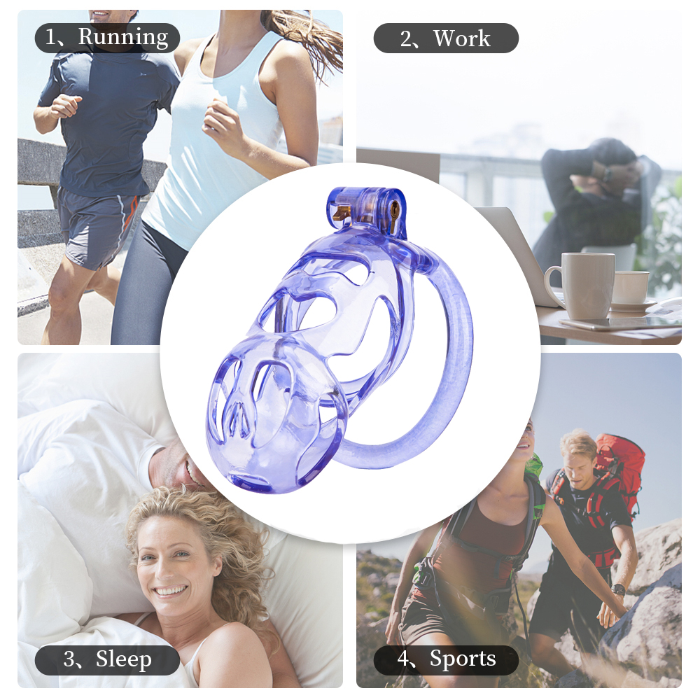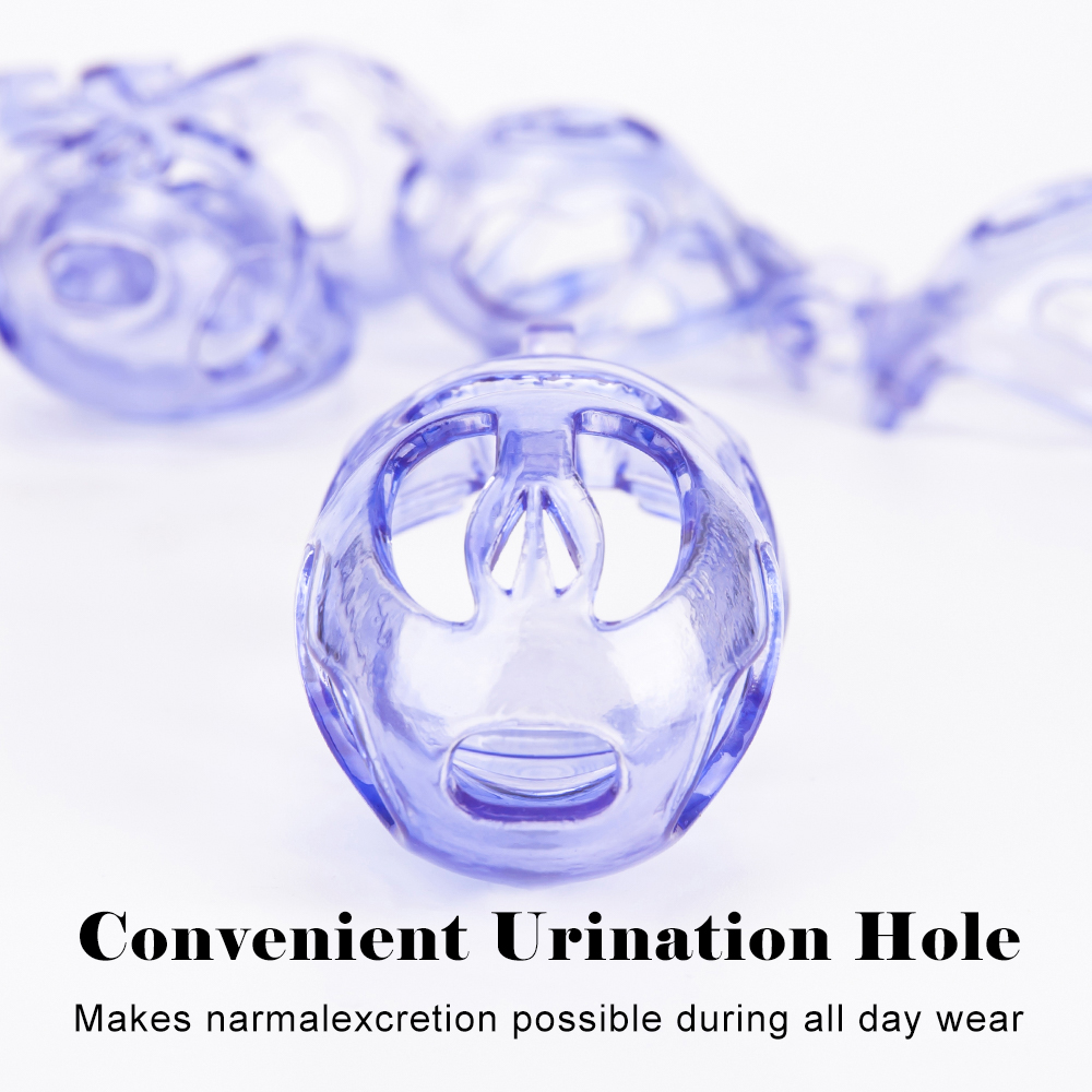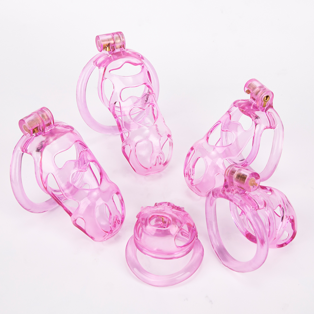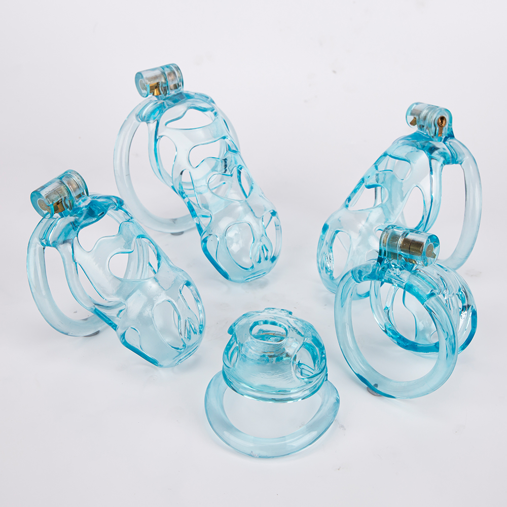 Gaiolas de castidade anatômicas com 5 tamanhos. São 6 anel de base com uma grande variedade de diâmetros. São anel de base retos. Modelos de cinto do compacto até os grande, pesando aproximadamente 80g de plástico ABS nas cores azuis, roxas, verdes ou rosas.