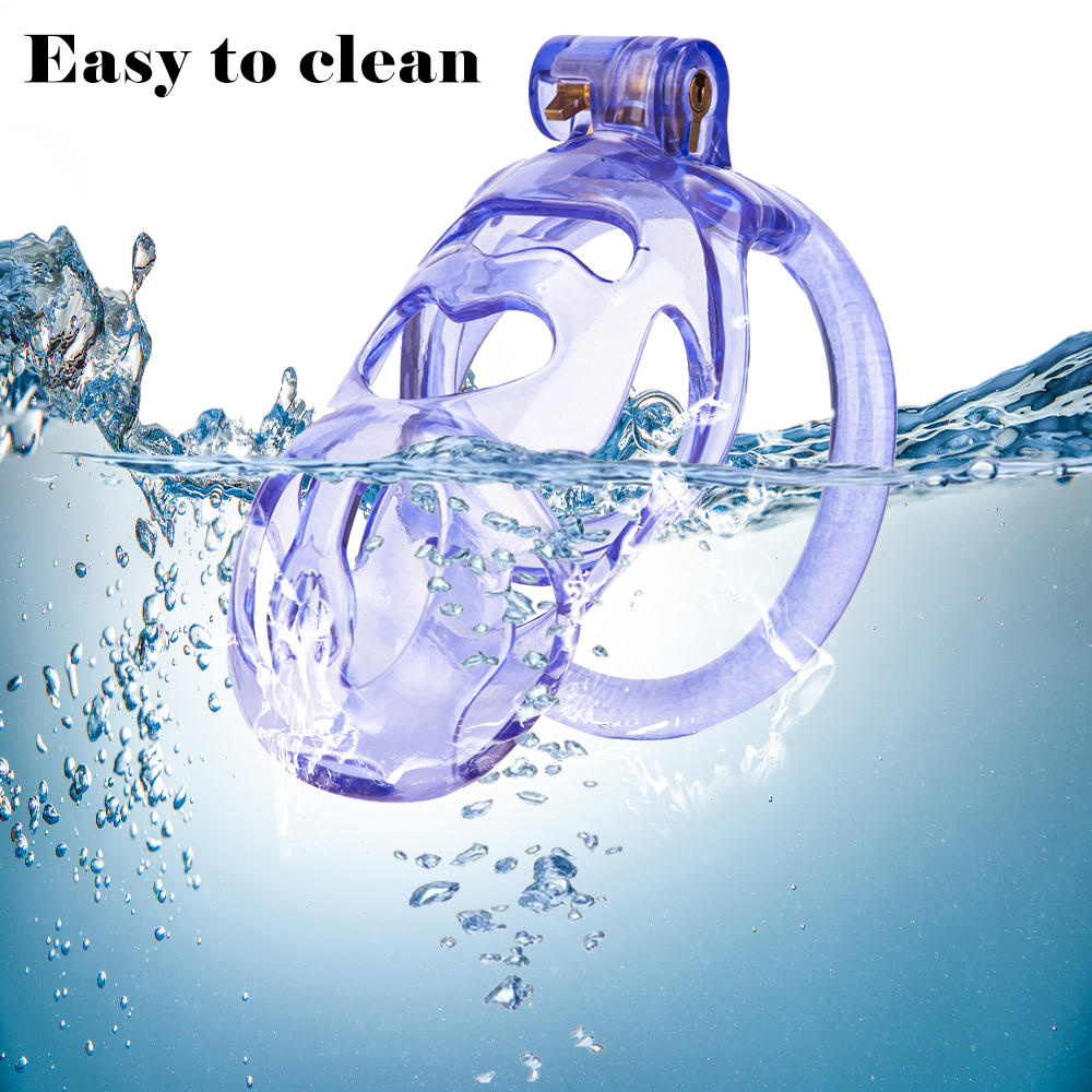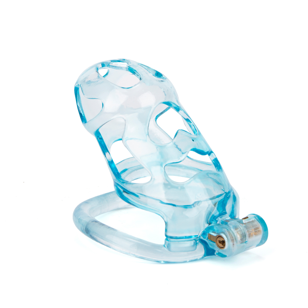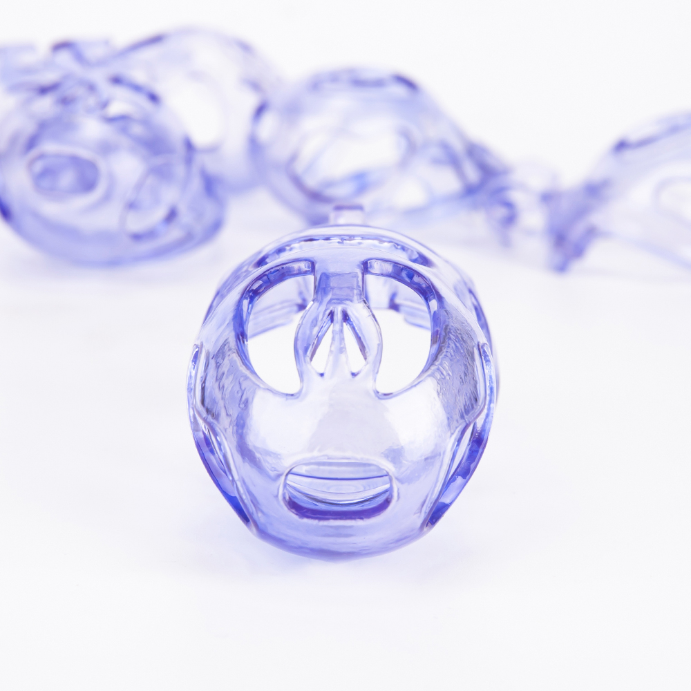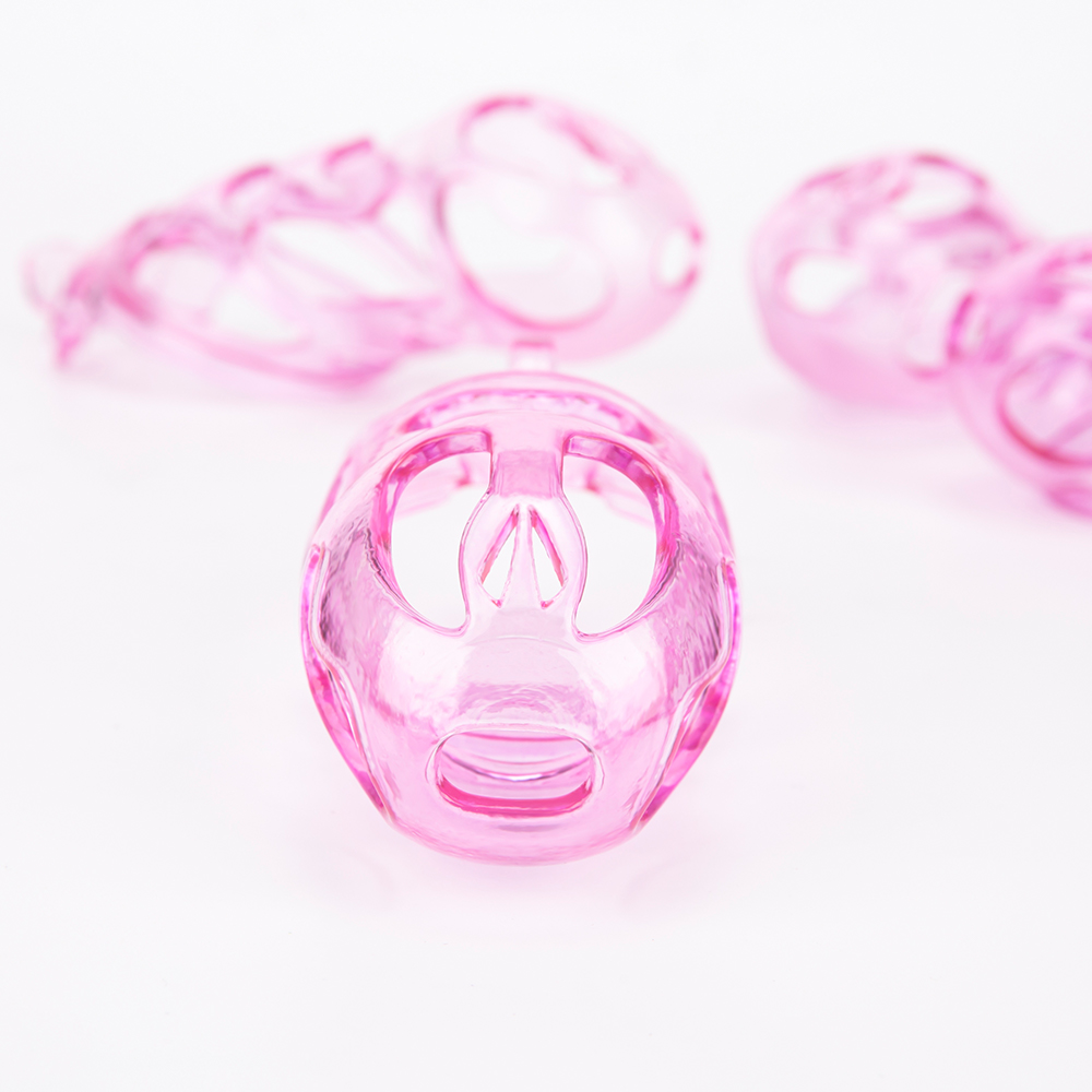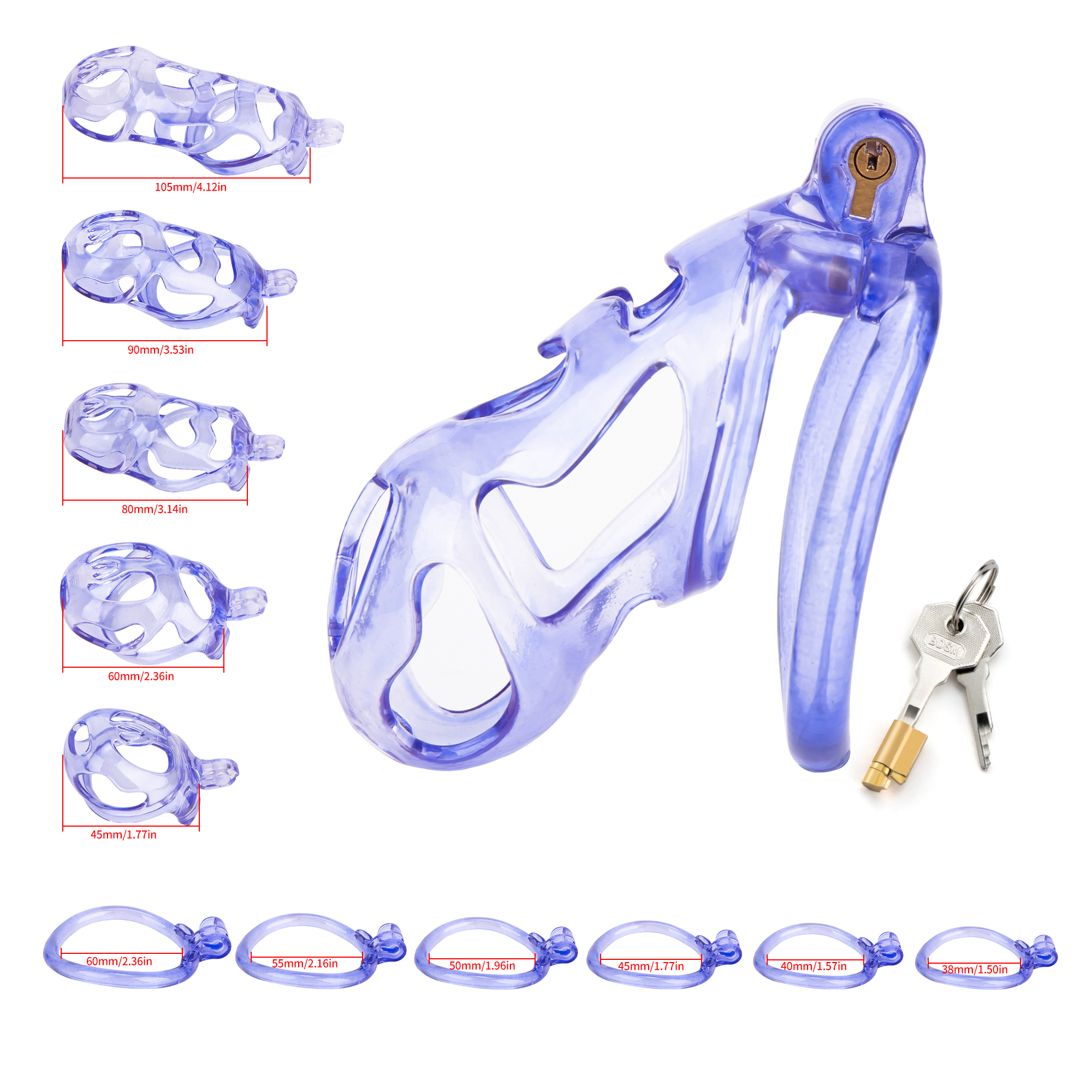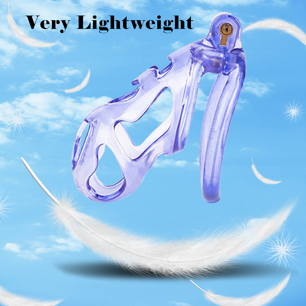 Gaiolas de castidade anatômicas com 5 tamanhos. São 6 anel de base com uma grande variedade de diâmetros. São anel de base retos. Modelos de cinto do compacto até os grande, pesando aproximadamente 80g de plástico ABS nas cores azuis, roxas, verdes ou rosas.