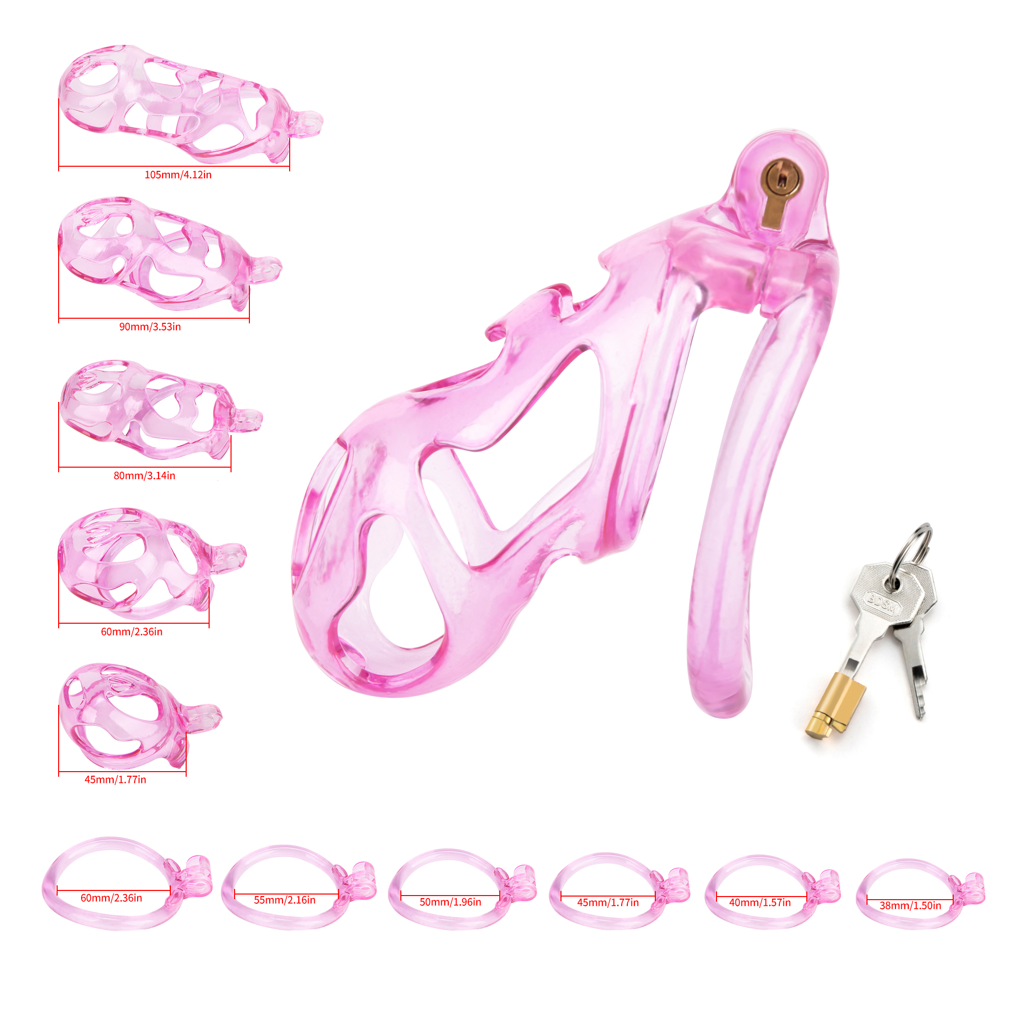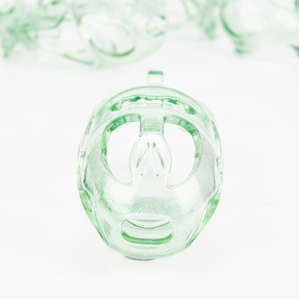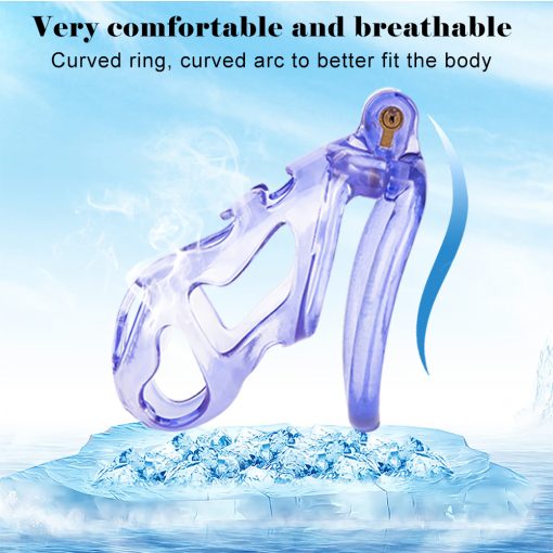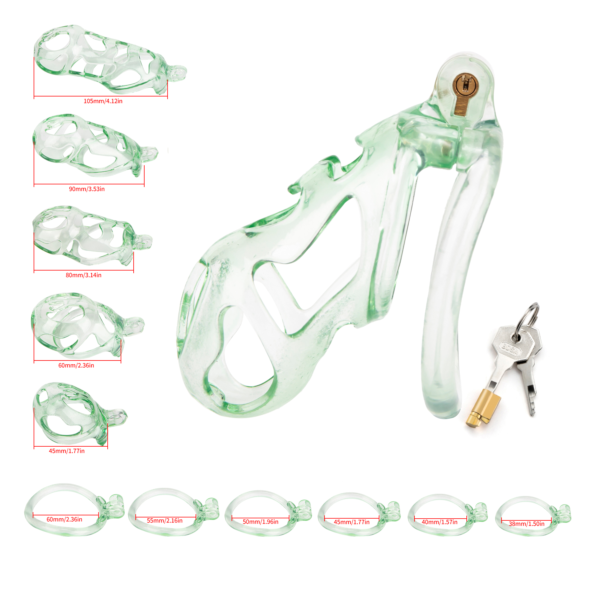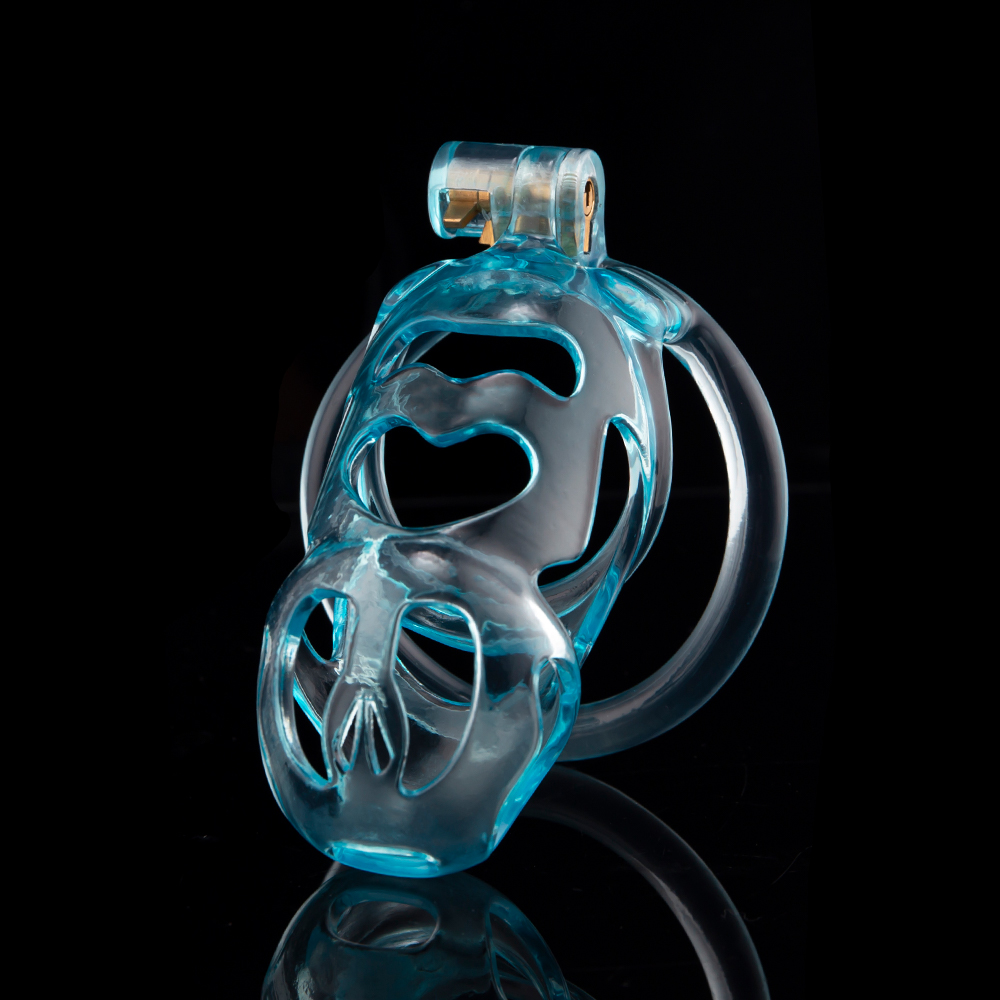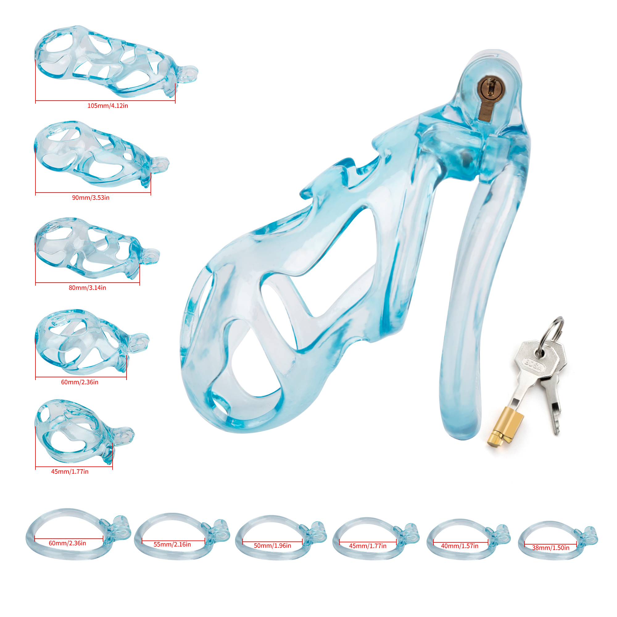 Gaiolas de castidade anatômicas com 5 tamanhos. São 6 anel de base com uma grande variedade de diâmetros. São anel de base retos. Modelos de cinto do compacto até os grande, pesando aproximadamente 80g de plástico ABS nas cores azuis, roxas, verdes ou rosas.