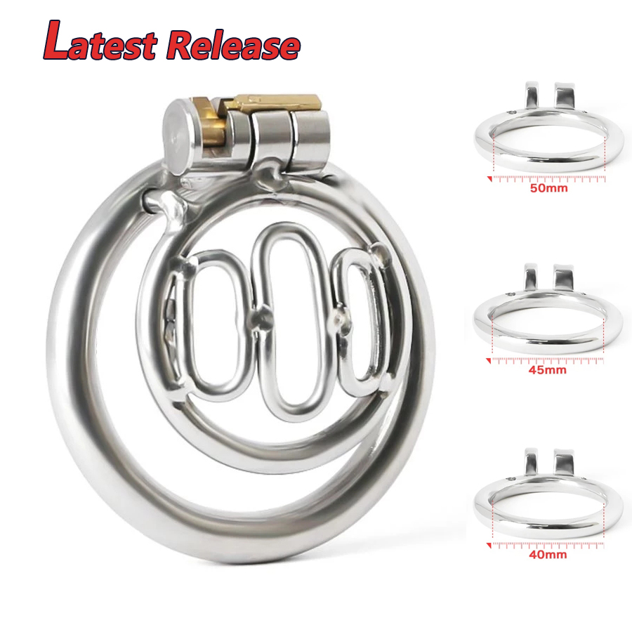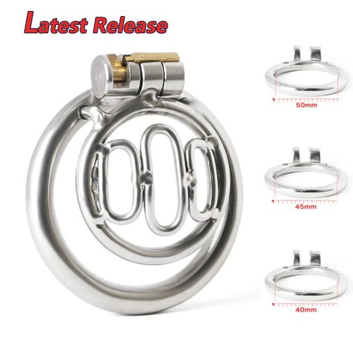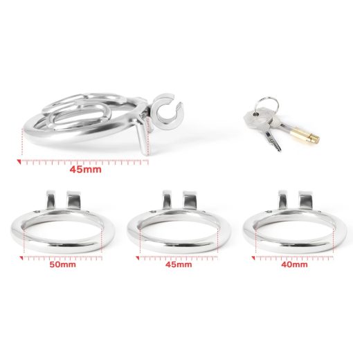 Opções para compra de gaiola de castidade de tamanho único Nub, com anéis ou somente os anéis. 3 anéis de base opcionais. Modelo de cinto compacto, pesando aproximadamente 100g de aço. Possuem elos de correntes vazados para passagem de líquidos, caso haja a necessidade de urinar durante o uso. Podem ser molhados.