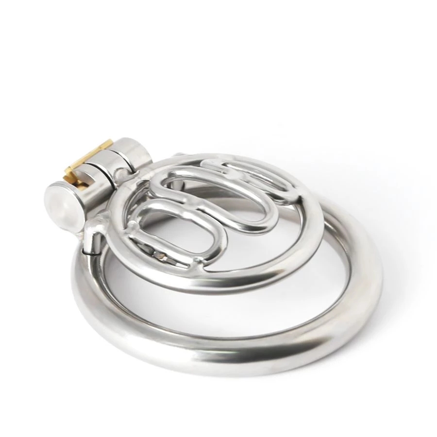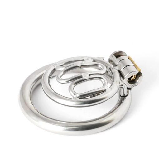 Cinto de castidade metálico com gaiola em elos paralelos soldados. Trancada por cilindro.