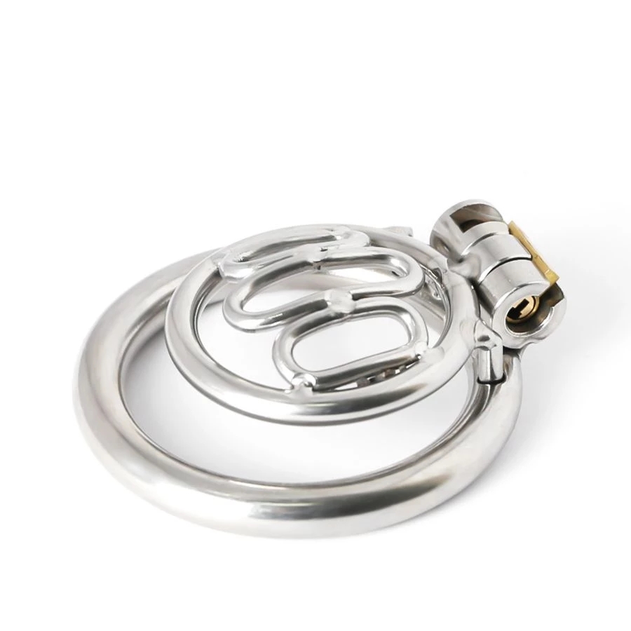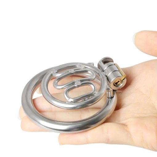 Cada anel possui um eixo argola para o encaixe da gaiola e para a fixação do cilindro interno. Um cinto pequeno para um grande e respeitável casto.