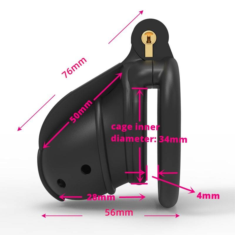 A gaiola possui tamanho aproximado interno de 3,4 cm de altura. É um produto discreto e permite o uso nas atividades comuns do dia-a-dia sem chamar muita atenção. O tamanho total de comprimento do cinto é de 5 cm do encaixe do anel até a camada externa da gaiola.