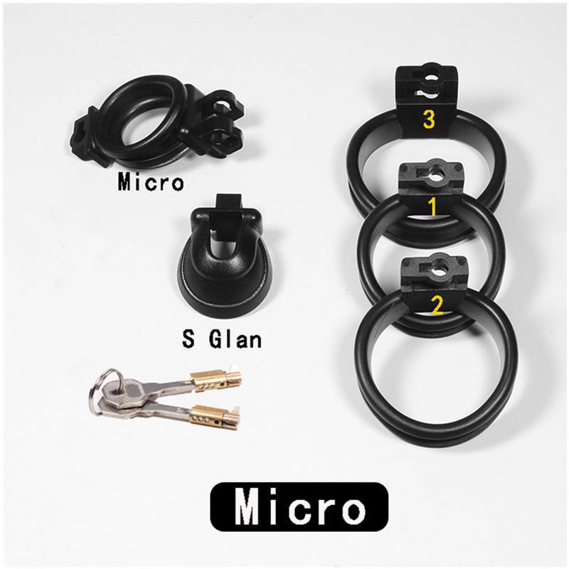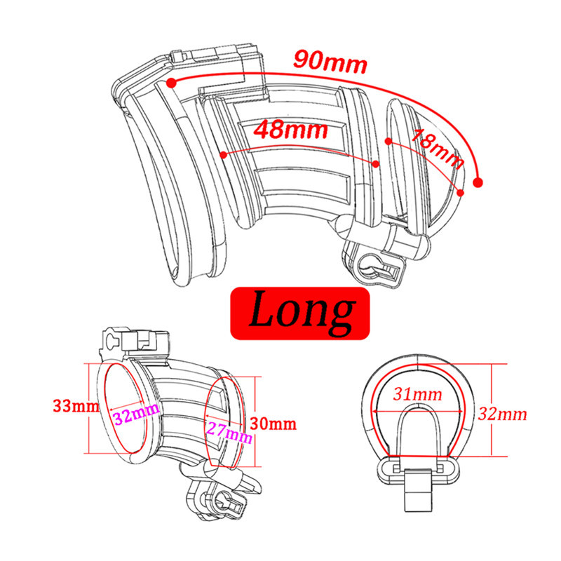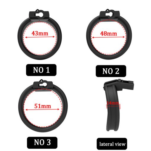 Gaiola de castidade de tamanhos variados, com 4 anel de base inclusos. É um modelo de cinto com gaiola em perpendicular, praticamente reta em relação ao corpo. Gaiola com poucos furos e abertura grande para a uretra, anatômicos e capazes de cobrir muito bem e prevenir quase qualquer contato com o pênis.