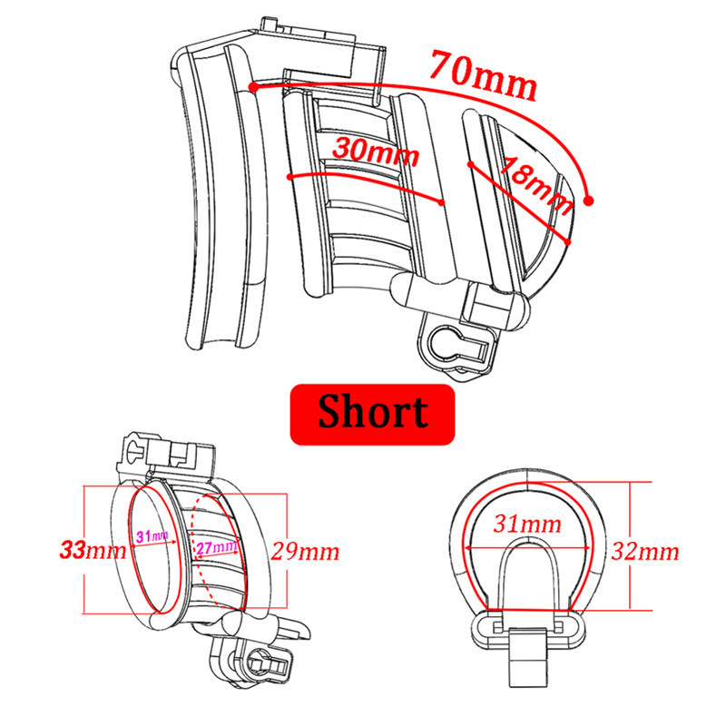 A gaiola possui 3 tamanhos aproximados internos de 5 cm, 7 cm e 9 de comprimento. É um cinto de castidade que chama a atenção, pois sua posição é praticamente reta, em relação ao corpo, com uma pequena queda, dependendo do seu corpo. Recomendado para uso em espaços particulares de muita privação e provocação.