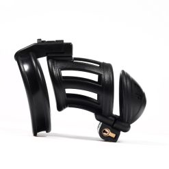 Este modelo possui dois encaixes precisos para os cilindros de trancamento – cadeado stealth magic locker. O cinto se divide em 3 partes, sendo possível destrancar e desmontar a proteção da glande para os propósitos desejados. Pode ser para higiene ou punir o submisso de alguma forma. Esta abertura para a uretra não proporciona suporte para fixação de tubos de cateter.
