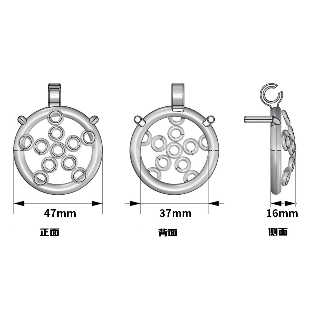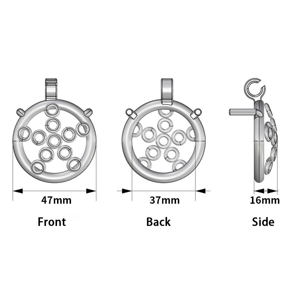 A gaiola possui tamanho aproximado interno e curvado de 1,6 cm. É um produto discreto e permite o uso nas atividades comuns do dia-a-dia sem chamar muita atenção. O tamanho interno da gaiola é de 1,4 cm de altura e diâmetro.