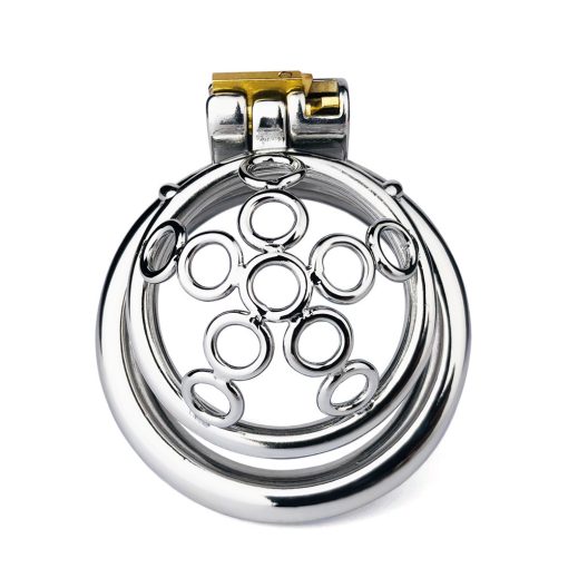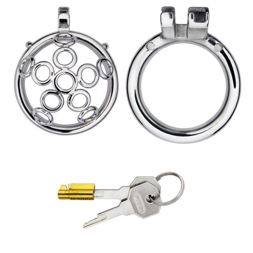 Gaiola de castidade de tamanho único e pequeno, com 4 anéis de base opcionais. É um modelo de cinto com um domo metálico capaz de cobrir muito bem e prevenir quase qualquer contato com o pênis. Possui aberturas para passagem de líquidos, caso haja a necessidade de urinar durante o uso. Pode ser molhado. Proteja e pratique a castidade com esta excelente gaiola de aço polido estrelada.