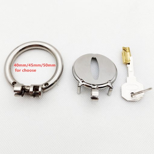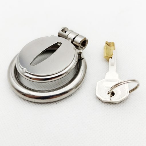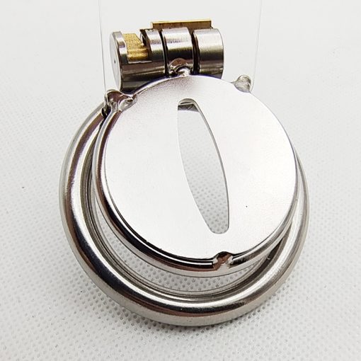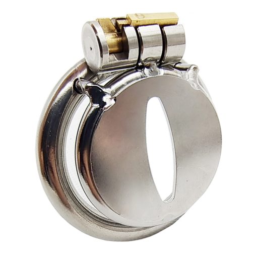 Cinto de castidade metálico pequeno de gaiola achatada reta. Trava por cilindro de chave.