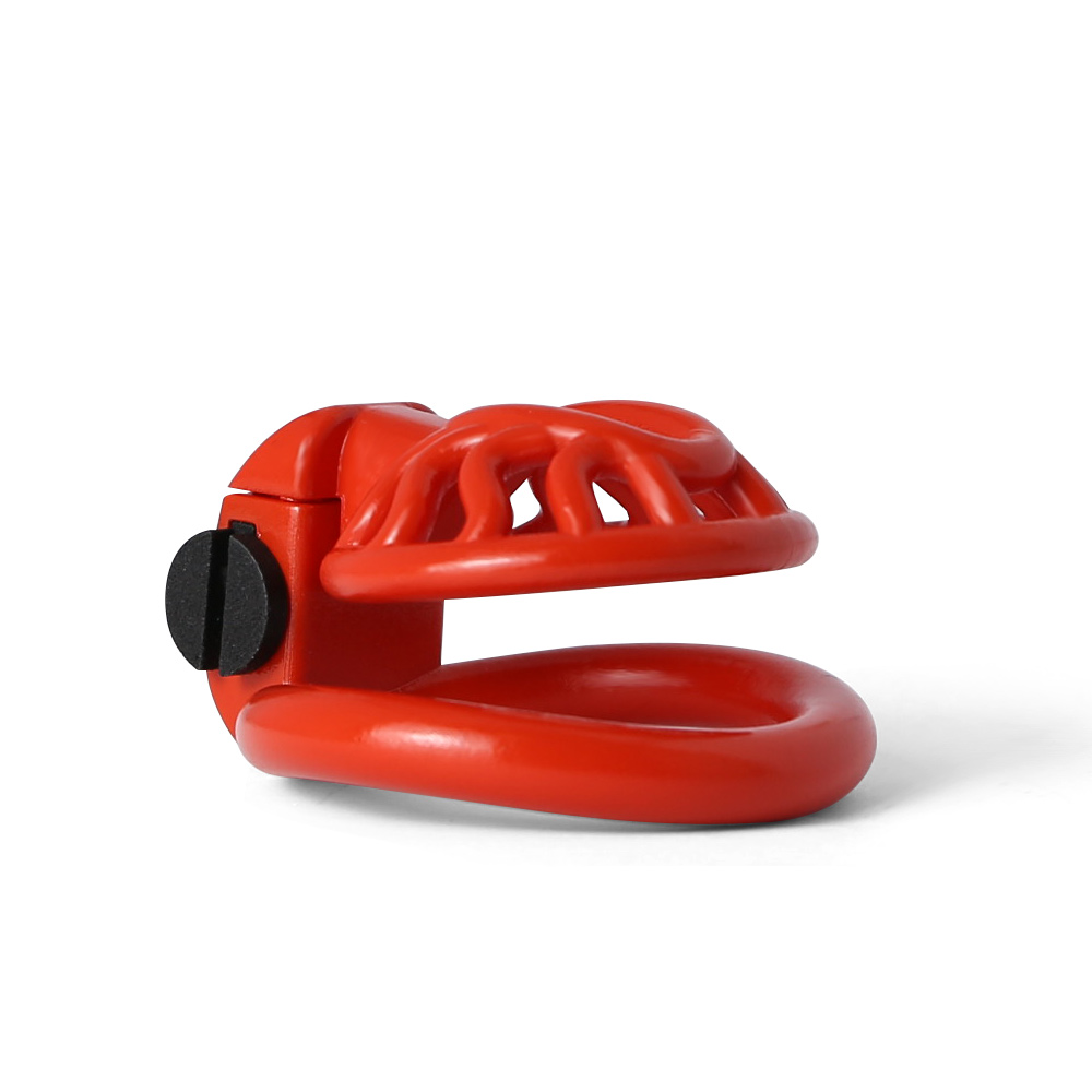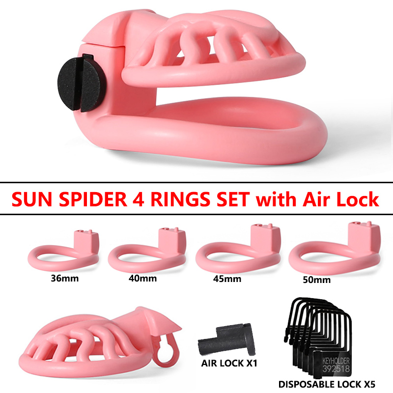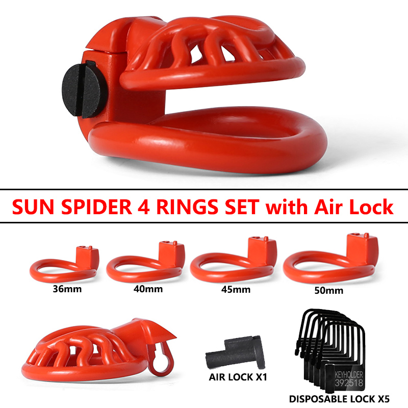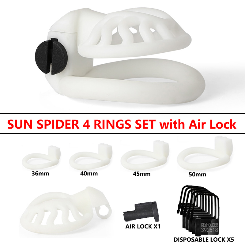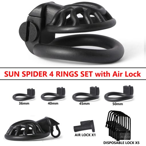 Gaiola de castidade de tamanho único micro, com 4 anéis de base inclusos. É um modelo de cinto com gaiola de ABS com tubos em formato de pequenas patas e pedipalpos de aranhas. Capaz de cobrir muito bem e prevenir quase qualquer contato com o pênis. São anéis de base levemente curvados em relação a base do pênis e testículos. 80g de plástico ABS nas cores pretas, vermelhas, brancas ou rosas.